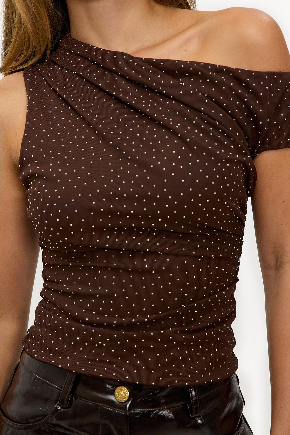 Brown off-the-shoulder top with rhinestones EUR 29.99This brown off shoulder top features an all-over shimmer polkadot print for a statement look. The asymmetrical one shoulder design with draped details creates a modern twist. The bodycon fit accentuates the shape in an elegant way. Style this top with leather-look pants for a chic night out.
