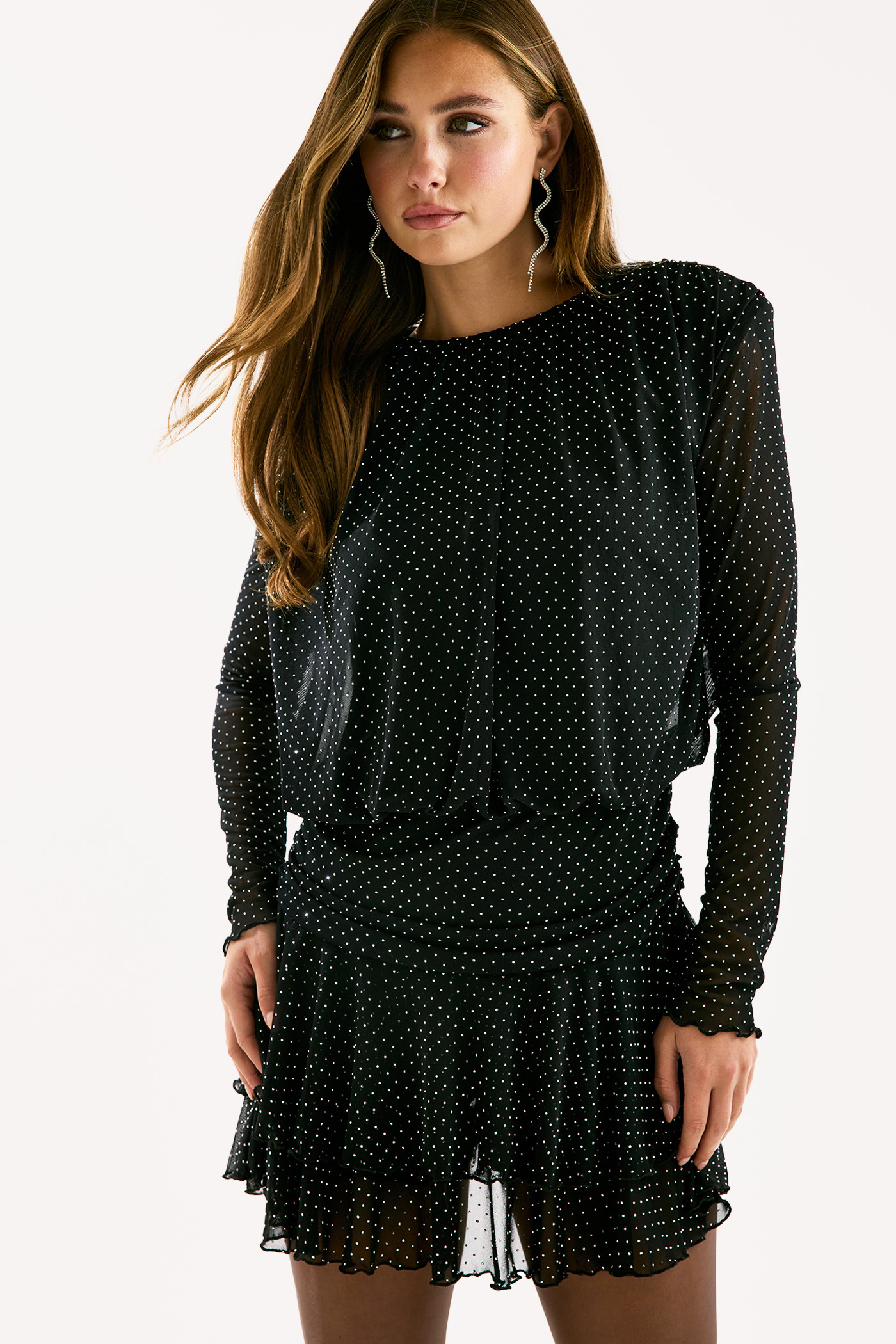 Black playsuit with rhinestones EUR 59.99This black playsuit features a chic polka dot print with subtle white dots all over. The sheer chiffon fabric with long sleeves and layered ruffle skirt creates a sophisticated look. The elastic waist and playful mini length give this playsuit a modern twist. Style this playsuit with statement earrings and heels for a dinner date look.