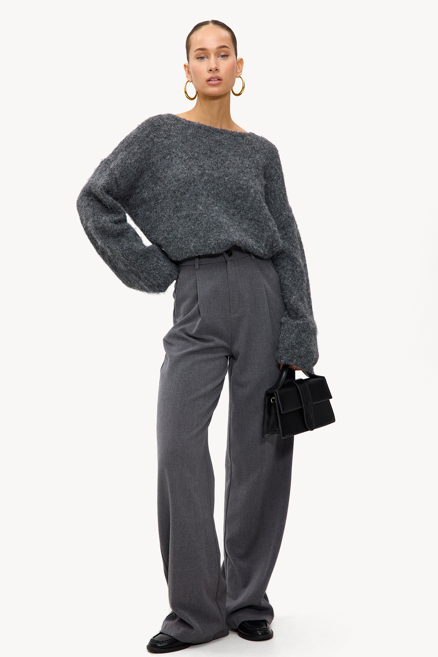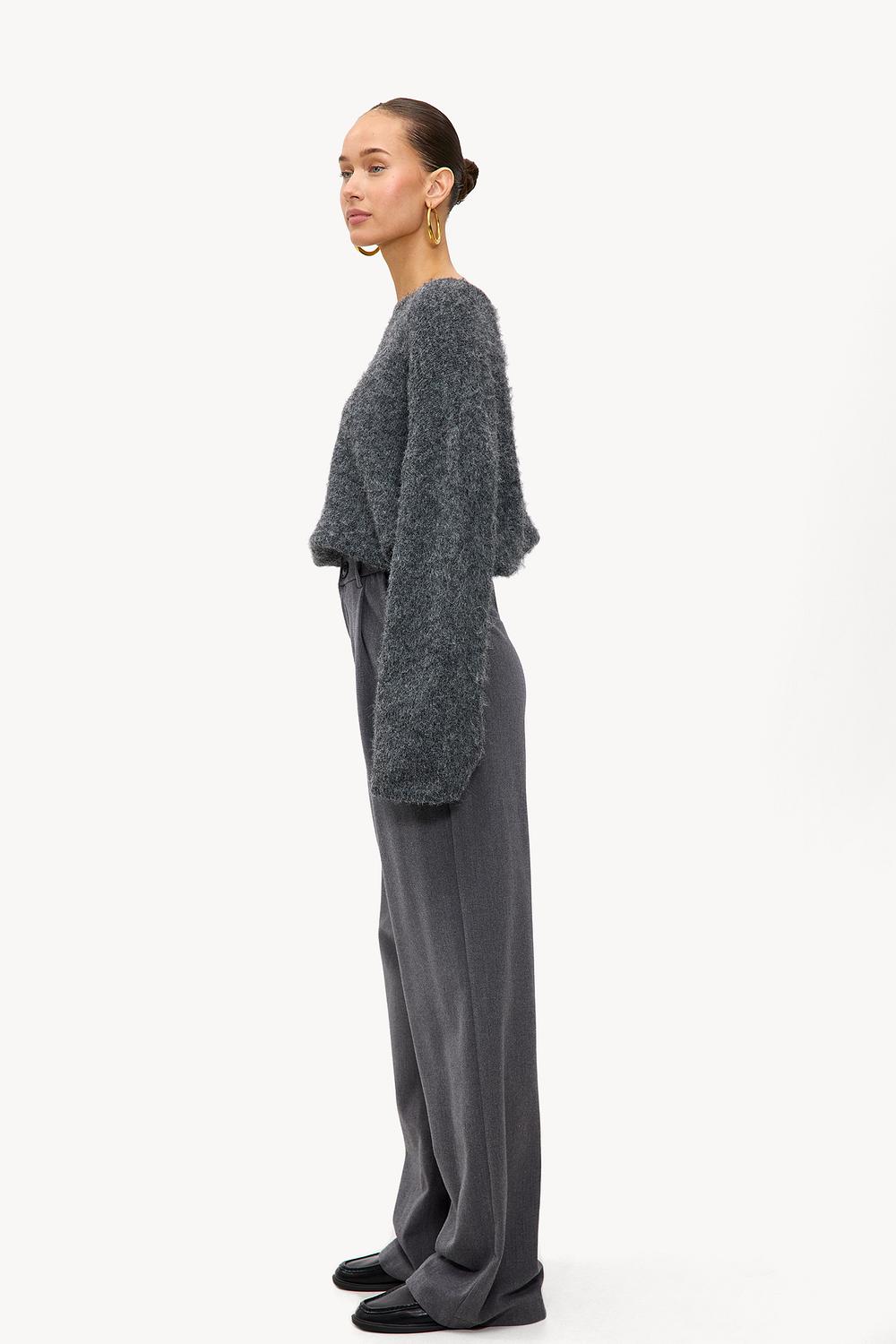 Grey trousers EUR 49.99These dark grey straight pants have a tailored fit with a high-waisted design. The classic button closure and pockets give a chic office look. The straight legs create a modern shape that pairs perfectly with an oversized knit sweater.