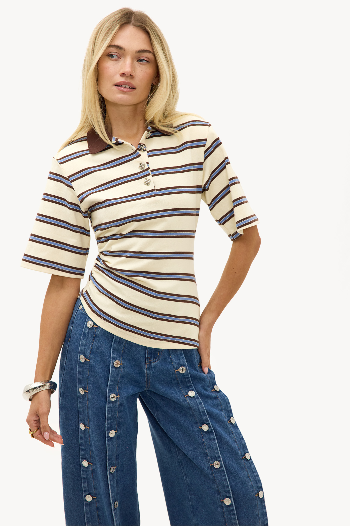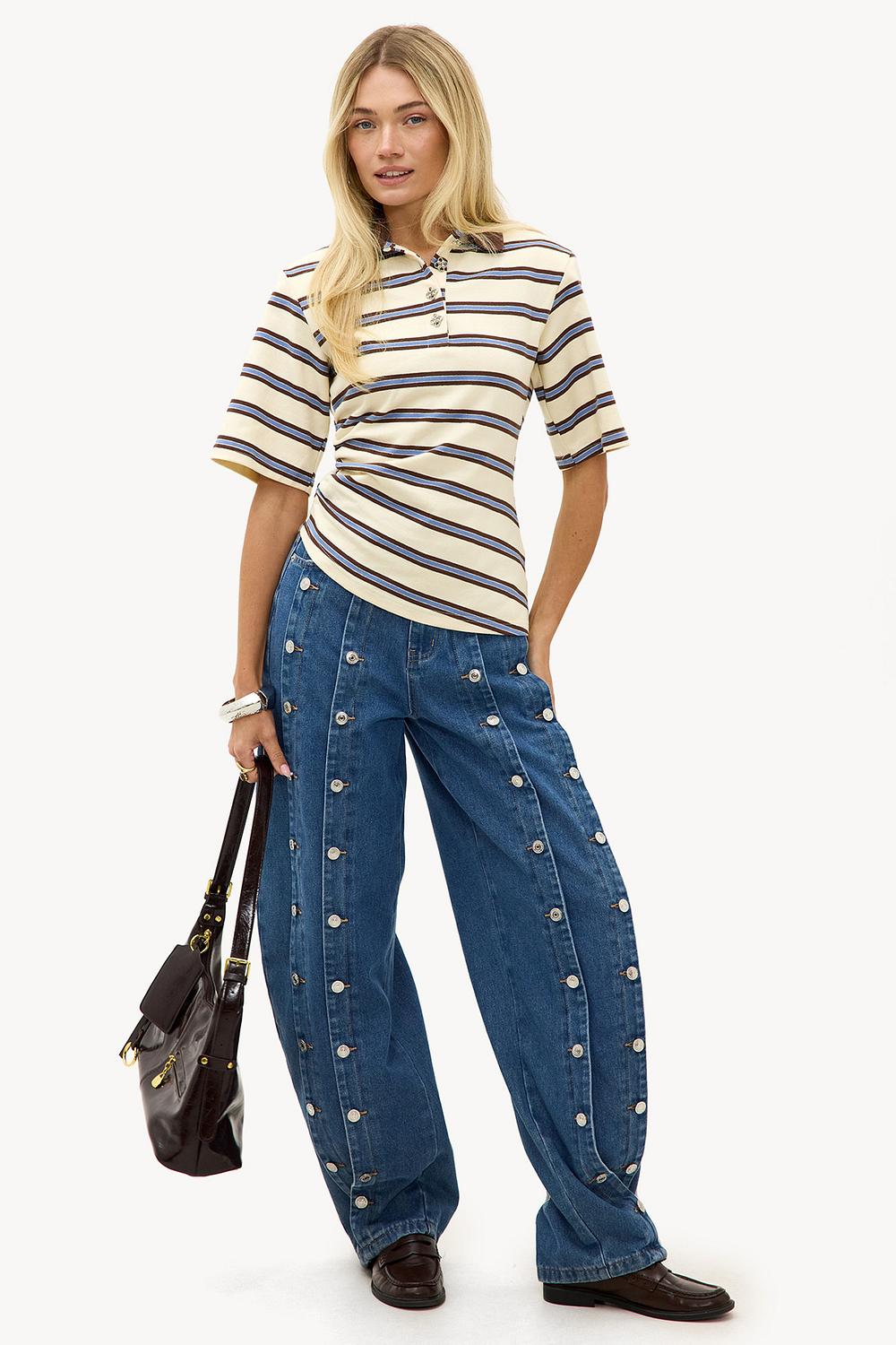 Light yellow striped polo shirt with shoulder padding EUR 45.99This striped polo top features a classic stripe pattern in light yellow with navy accents. The relaxed fit with short sleeves, shoulder pads, and front button closure creates a casual chic look. The soft polyester-cotton blend ensures comfort and a nice fit. Style this top with high-waisted wide-leg jeans for an effortless casual outfit.