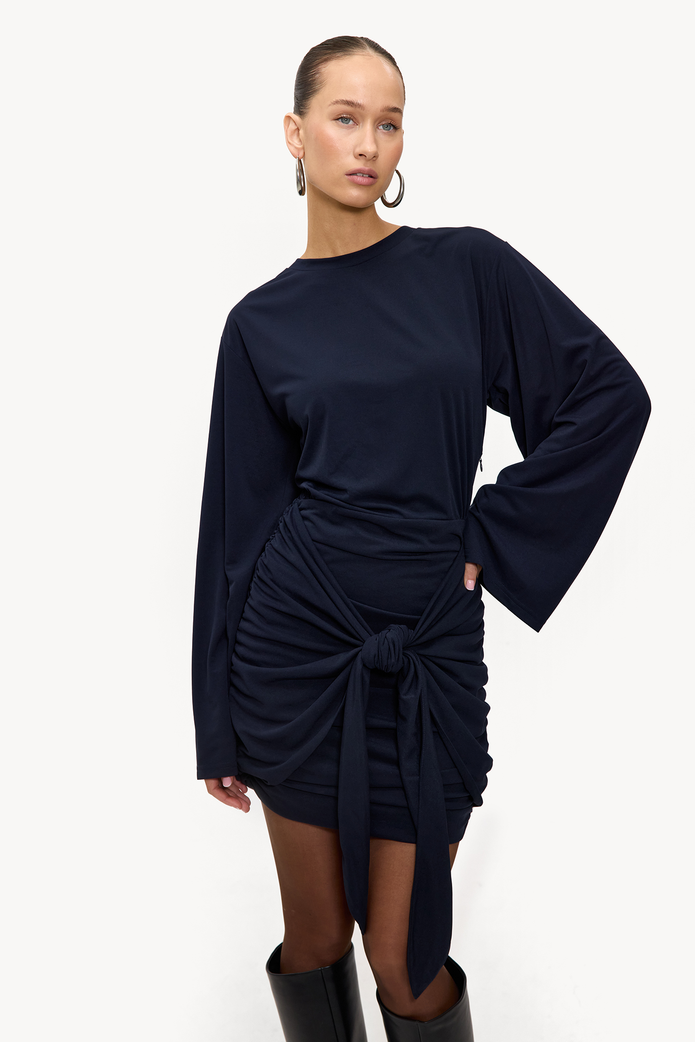 Dark blue dress with bow detail EUR 49.99This navy mini dress features a striking wrap detail with a tie belt for a statement look. The long sleeves and draped fit create a chic appearance with a modern twist. The bodycon fit elegantly accentuates the shape. Style this dress with high boots for a cool city look.