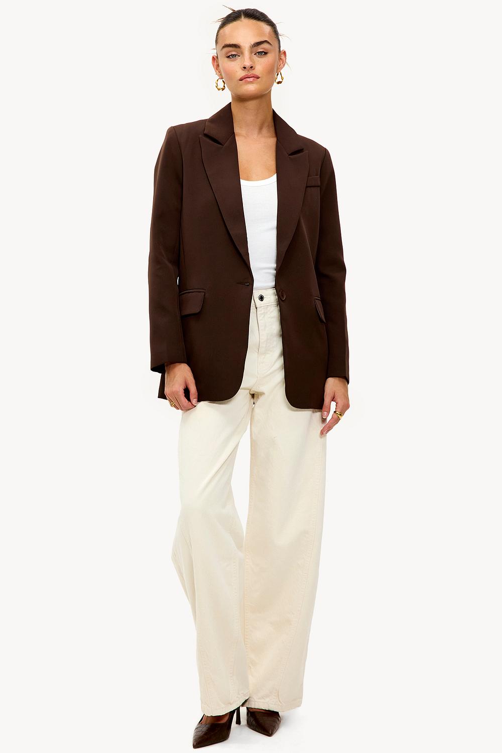 This chocolate brown blazer features a classic tailored fit with statement lapels for a chic look. The oversized fit with a single button closure and front pockets creates a modern twist on the timeless blazer design. The rich brown color gives this blazer a luxurious appearance that is perfect for office days or a dinner date.