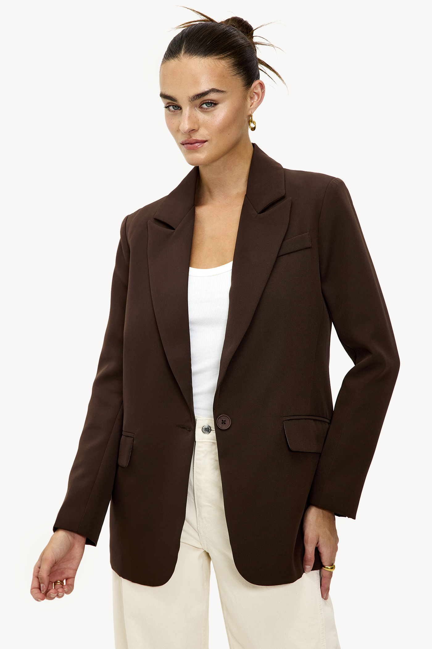 Dark brown blazer EUR 69.99This chocolate brown blazer features a classic tailored fit with statement lapels for a chic look. The oversized fit with a single button closure and front pockets creates a modern twist on the timeless blazer design. The rich brown color gives this blazer a luxurious appearance that is perfect for office days or a dinner date.