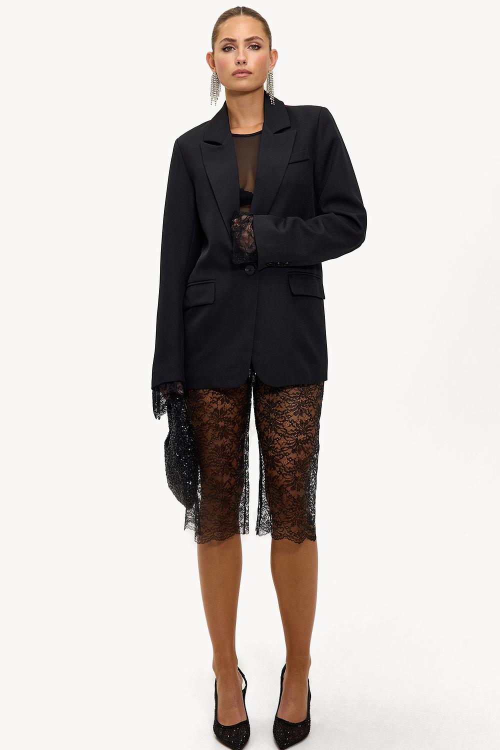 These black lace shorts feature a luxurious transparent design with subtle sparkle details. The high-waisted fit with decorative floral patterns creates a statement look. The midi length with elegant lace texture ensures a sophisticated appearance. Style these shorts with an oversized blazer for a chic evening look.