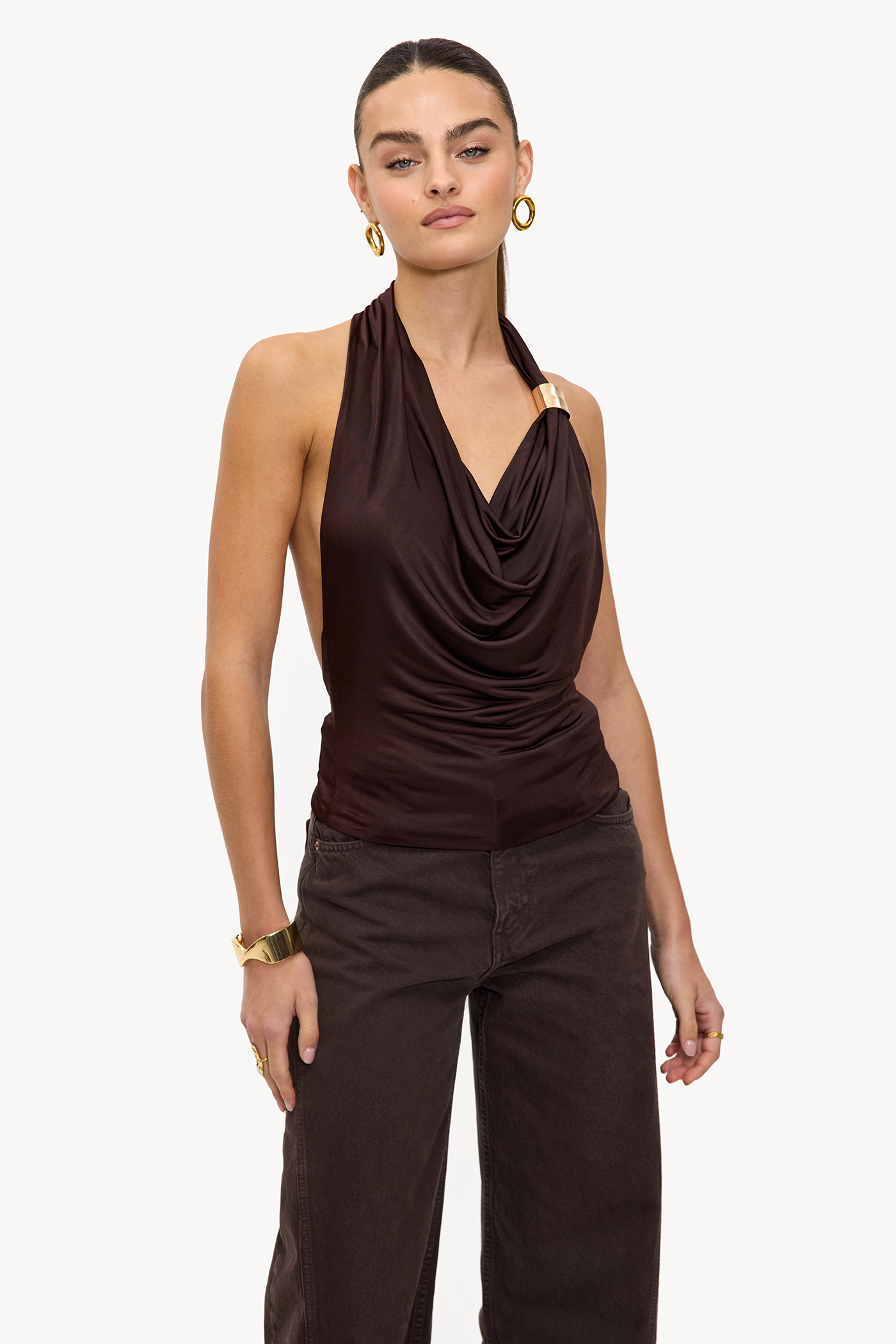 Brown halter top with gold detail EUR 27.99This dark brown halter top features a luxurious draped design with a deep cowl neck for a sophisticated look. The backless cut with a gold accent detail on the halter strap creates a statement appearance. The bodycon fit accentuates the shape in a chic way. Style this top with wide-leg pants for a dinner date look.