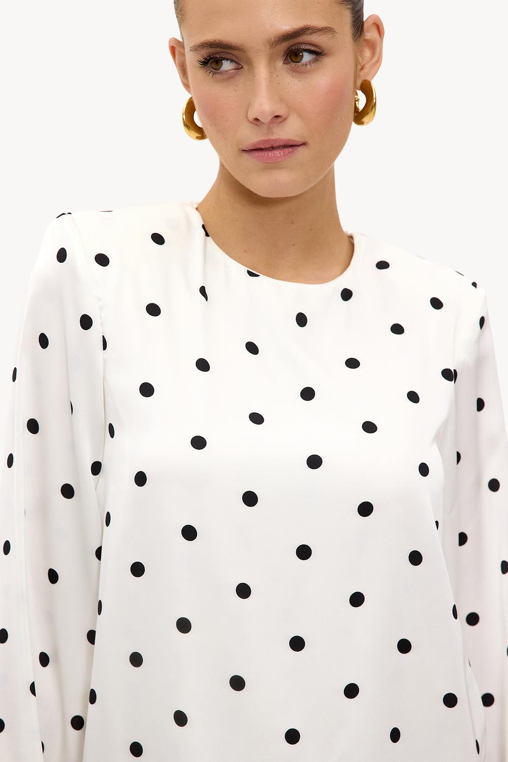 This white long sleeve top features a classic polka dot print with black dots all over. The relaxed fit with a round neckline and button closure at the back creates a comfortable look. The soft polyester quality ensures a smooth wear and easy maintenance. Style this top with black wide-leg trousers for a chic contrast.