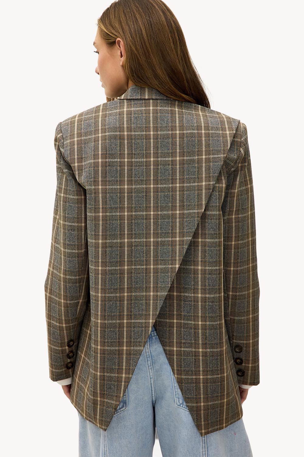 Gray checkered blazer EUR 79.99This grey blazer features a classic checked pattern with subtle brown accents for a timeless look. The tailored fit with shoulder padding and button closure creates a professional shape. The oversized fit gives this blazer a cool twist. Style this blazer with wide-leg jeans and loafers for a chic casual look.