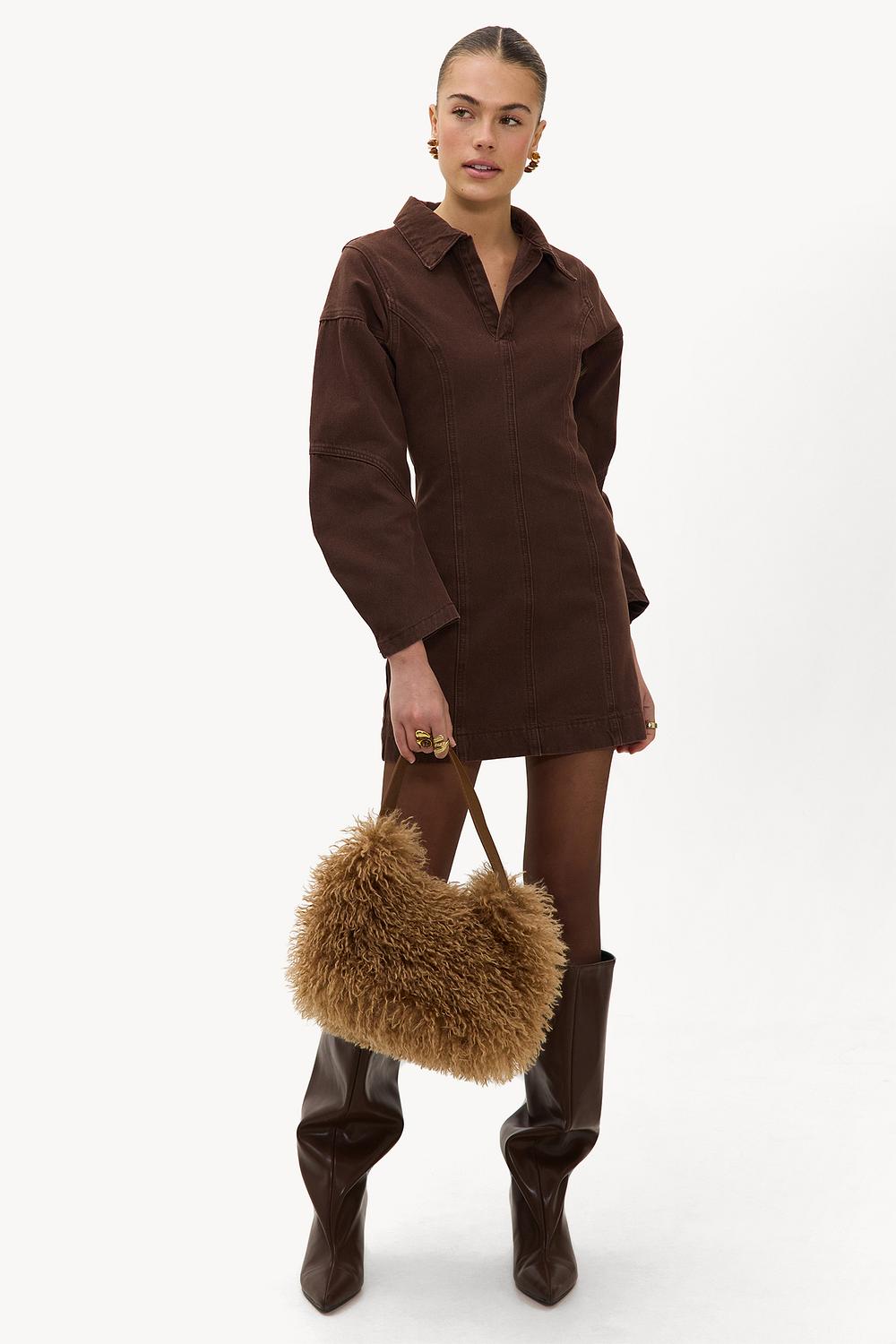 Brown denim dress EUR 69.99This dark brown denim dress features statement balloon sleeves. The relaxed fit and classic collar create an effortless chic look. The soft cotton blend ensures comfort and a luxurious appearance. Style this dress with knee-high boots for a cool spring-ready outfit.