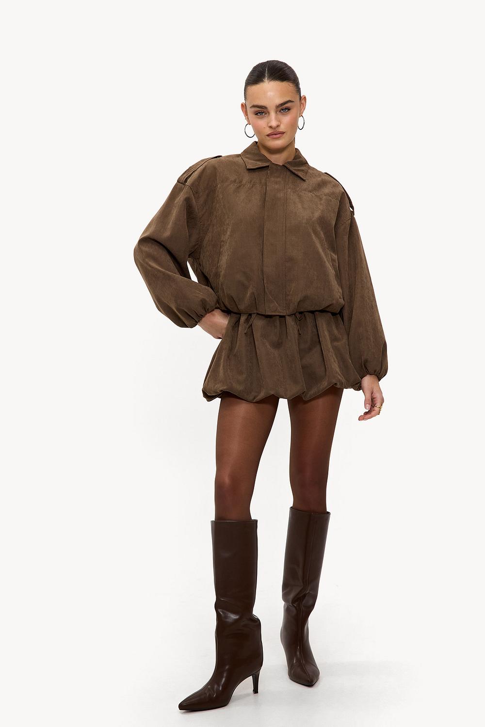 Brown skirt with suede look EUR 35.99This brown mini skirt has a suede-like texture with an elastic waist and tie detail. The subtle pleats create a modern shape with extra volume. The high-waisted fit accentuates the waist for a chic look. Style this skirt with a fitted top and high boots for a cool autumn vibe.