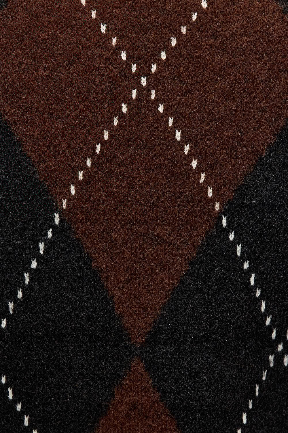 Brown sweater with checkered print EUR 59.99This brown knit longsleeve features a striking checkered pattern in brown and black. The mock neck and cropped fit give this sweater a modern twist. The white contrasting stitches accentuate the graphic design for a statement look. Style this knit with high-waisted wide leg jeans for a chic casual outfit.