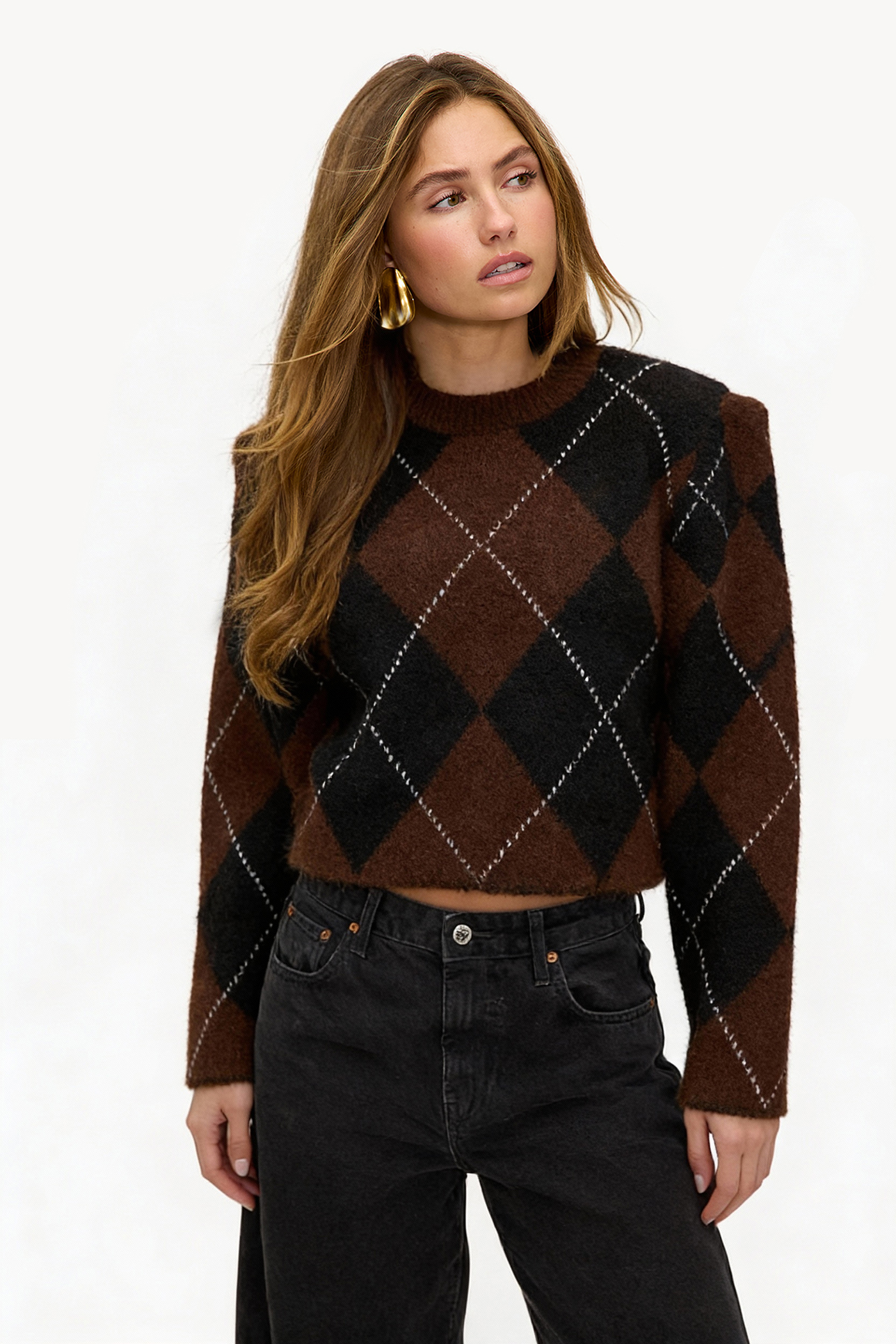 Brown sweater with checkered print EUR 59.99This brown knit longsleeve features a striking checkered pattern in brown and black. The mock neck and cropped fit give this sweater a modern twist. The white contrasting stitches accentuate the graphic design for a statement look. Style this knit with high-waisted wide leg jeans for a chic casual outfit.