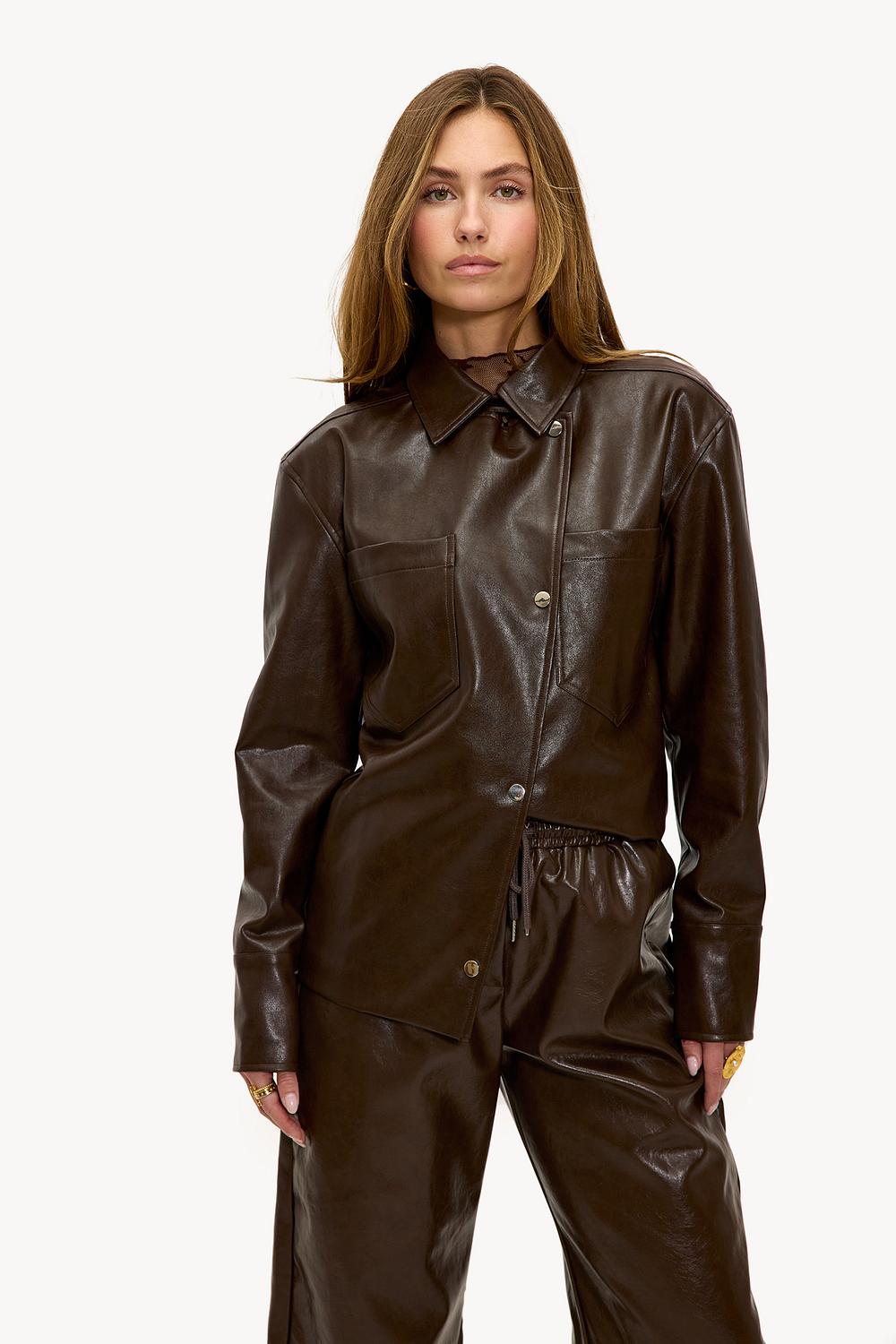 This dark brown vegan leather jacket has an oversized fit with statement chest pockets and silver snap buttons. The relaxed fit with classic collar and waistband creates a cool utility design. Style this jacket with the matching wide leg trousers for a stunning co-ord look.