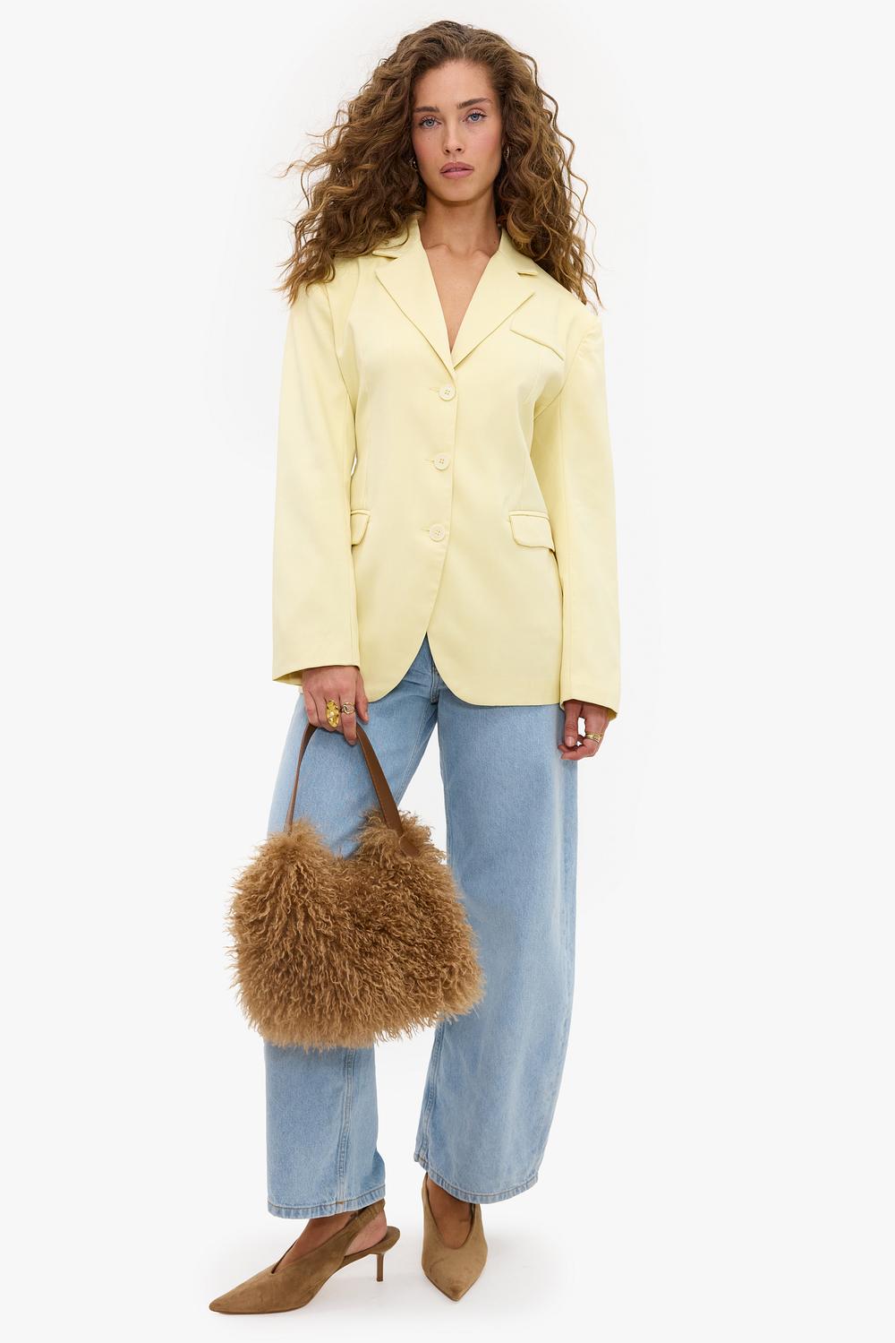 Light yellow blazer with shoulder pads EUR 79.99This light yellow blazer has a classic tailored fit with a statement oversized silhouette. The front button closure and functional pockets give a timeless twist to this design. The extended length creates a modern shape that is perfect for office days or casual moments. Style this blazer with wide-leg jeans for a chic look.