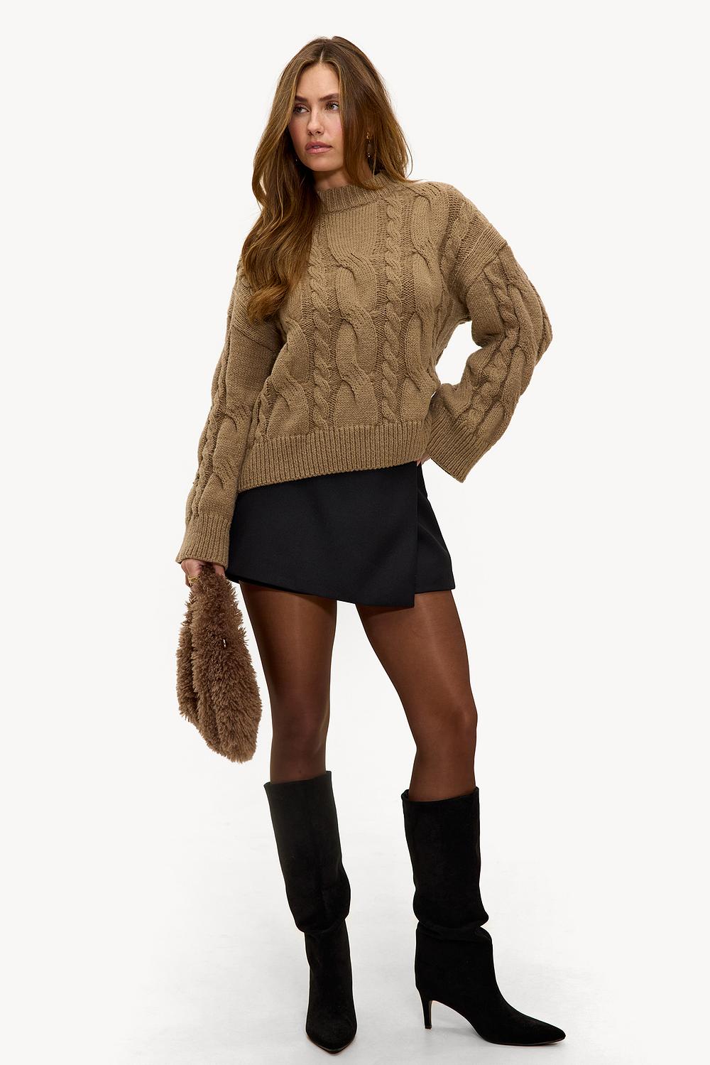 Taupe cable knit sweater EUR 59.99This taupe cable knit sweater features a luxurious textured design with striking braided patterns all over. The mock neck and oversized fit with ribbed cuffs create a cool casual look. The statement wide sleeves give this jumper a chic twist. Style this sweater with a black mini skirt and high boots for a perfect autumn look.