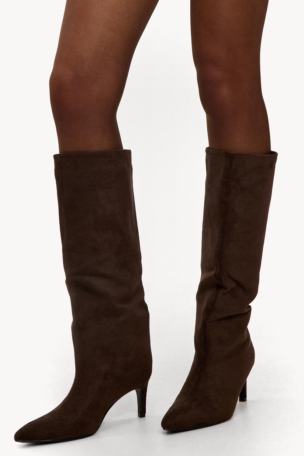 Brown suede-look boots EUR 69.99These dark brown suede-like high boots feature a chic knee-high design with a pointed toe. The elegant heel and luxurious texture give these boots a sophisticated look. Perfect to style with an oversized sweater and mini skirt for a cool autumn look.