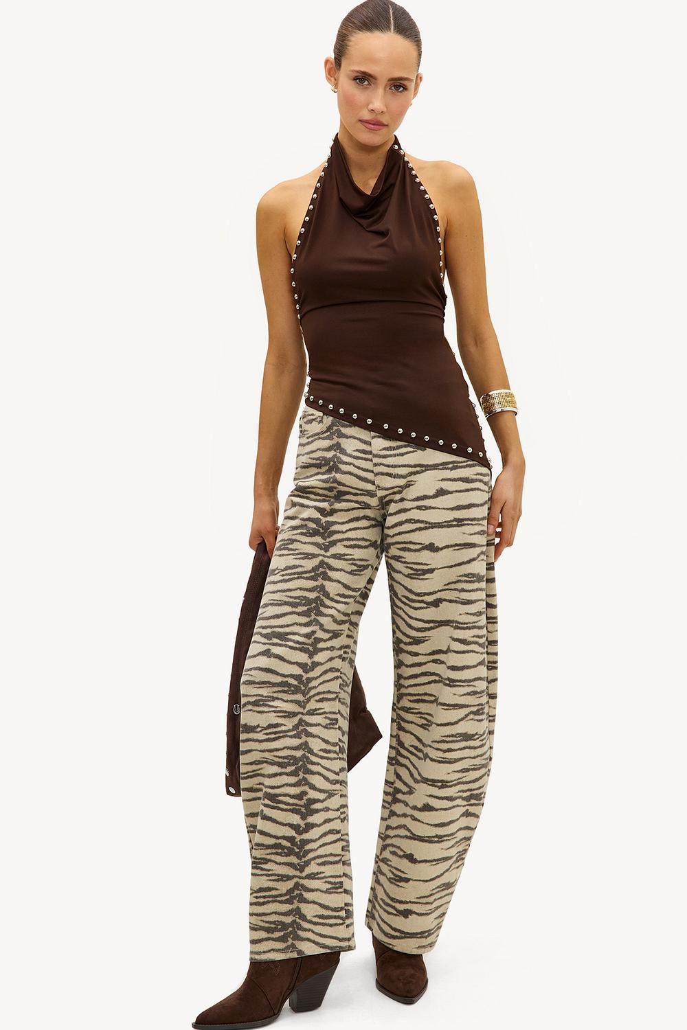 Dark brown halter top with silver studs EUR 29.99This dark brown halter top features a luxurious cowl neck design with striking studs all over the edges. The draped neckline and bodycon fit create a chic appearance. The stretch quality ensures comfort and a perfect fit. Style this top with zebra print pants for a statement animal print look.