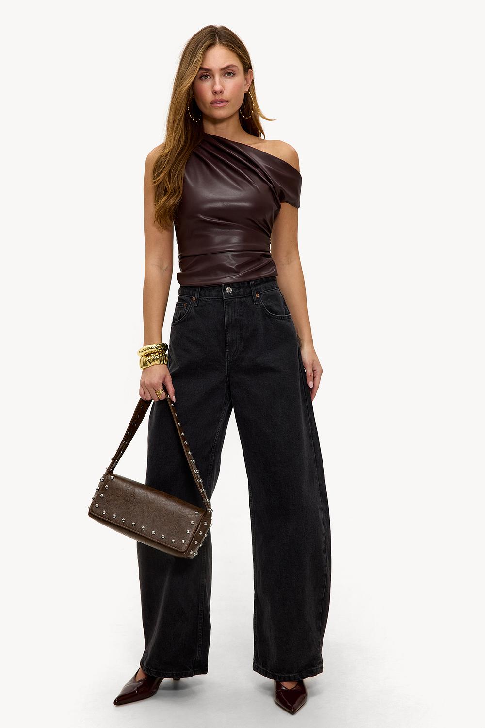 Dark brown PU top EUR 35.99This dark brown leather-look top features an asymmetrical off-shoulder design with draped details. The bodycon fit with ruching on the side accentuates the shape for a statement look. The luxurious vegan leather quality provides an edgy twist on the classic off-shoulder style. Style this top with wide-leg jeans and statement accessories for a girls' night out.