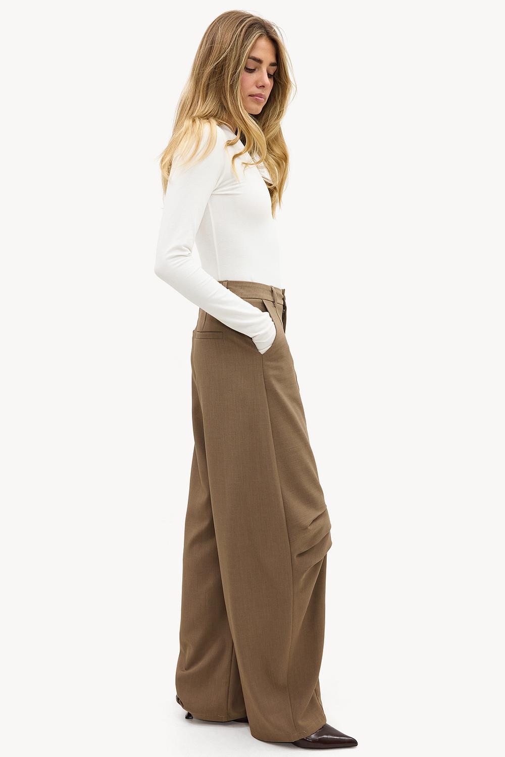 Taupe balloon trousers EUR 49.99These taupe wide-leg trousers feature striking draped details on the side for a statement look. The high-waisted fit with wide legs creates a chic silhouette that perfectly aligns with the office-to-evening trend. The luxurious polyester quality ensures a beautiful drape and comfort. Style these trousers with the matching blazer for a powerful co-ord look during office days.