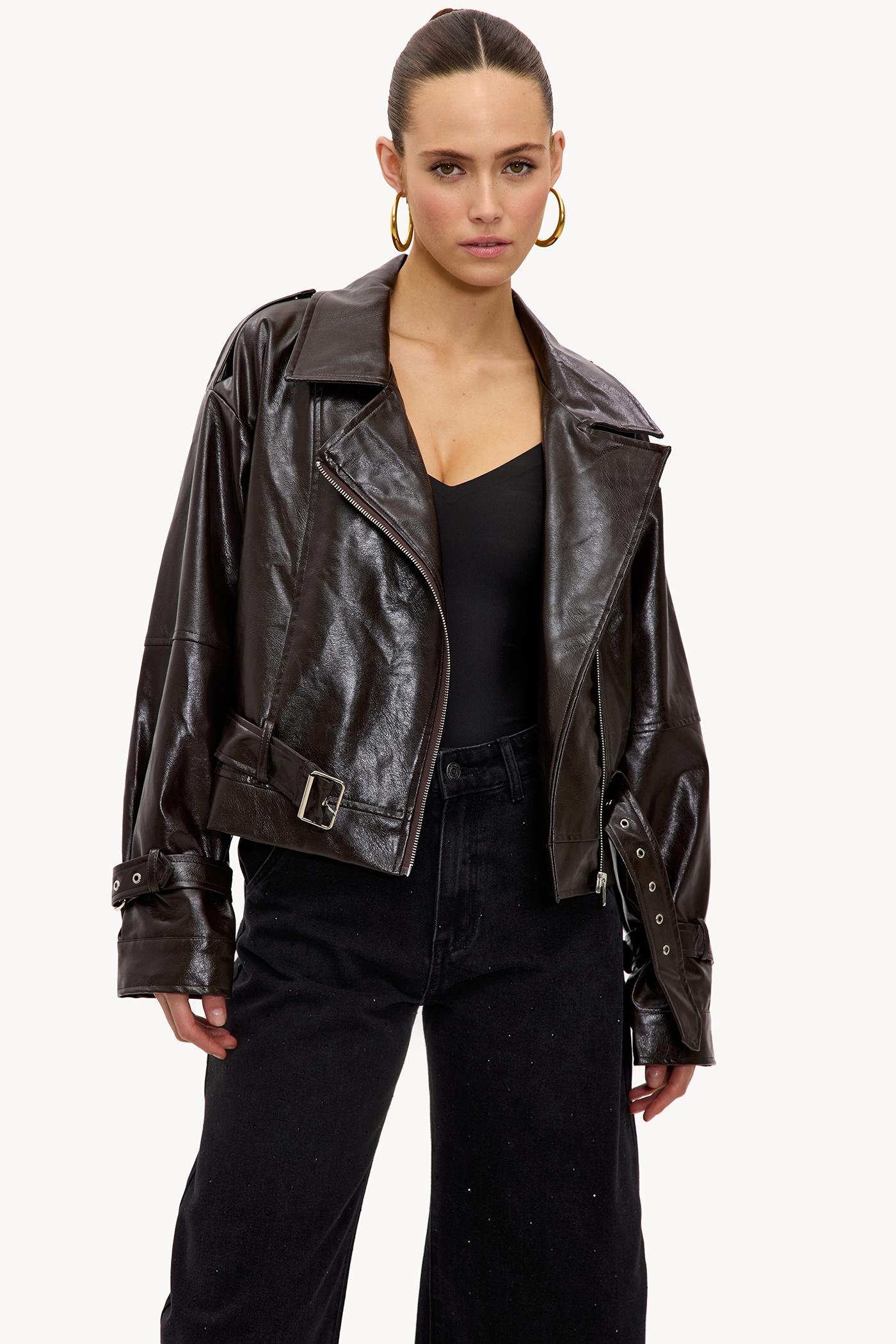 Dark brown PU jacket EUR 89.99This dark brown leather-look biker jacket features a classic design with an asymmetrical zipper. The oversized fit with statement belt and hardware details creates an edgy look. The wide lapels and robust zippers give this jacket an authentic biker vibe. Style this jacket with black wide-leg jeans and chunky boots for a rock-chic outfit.