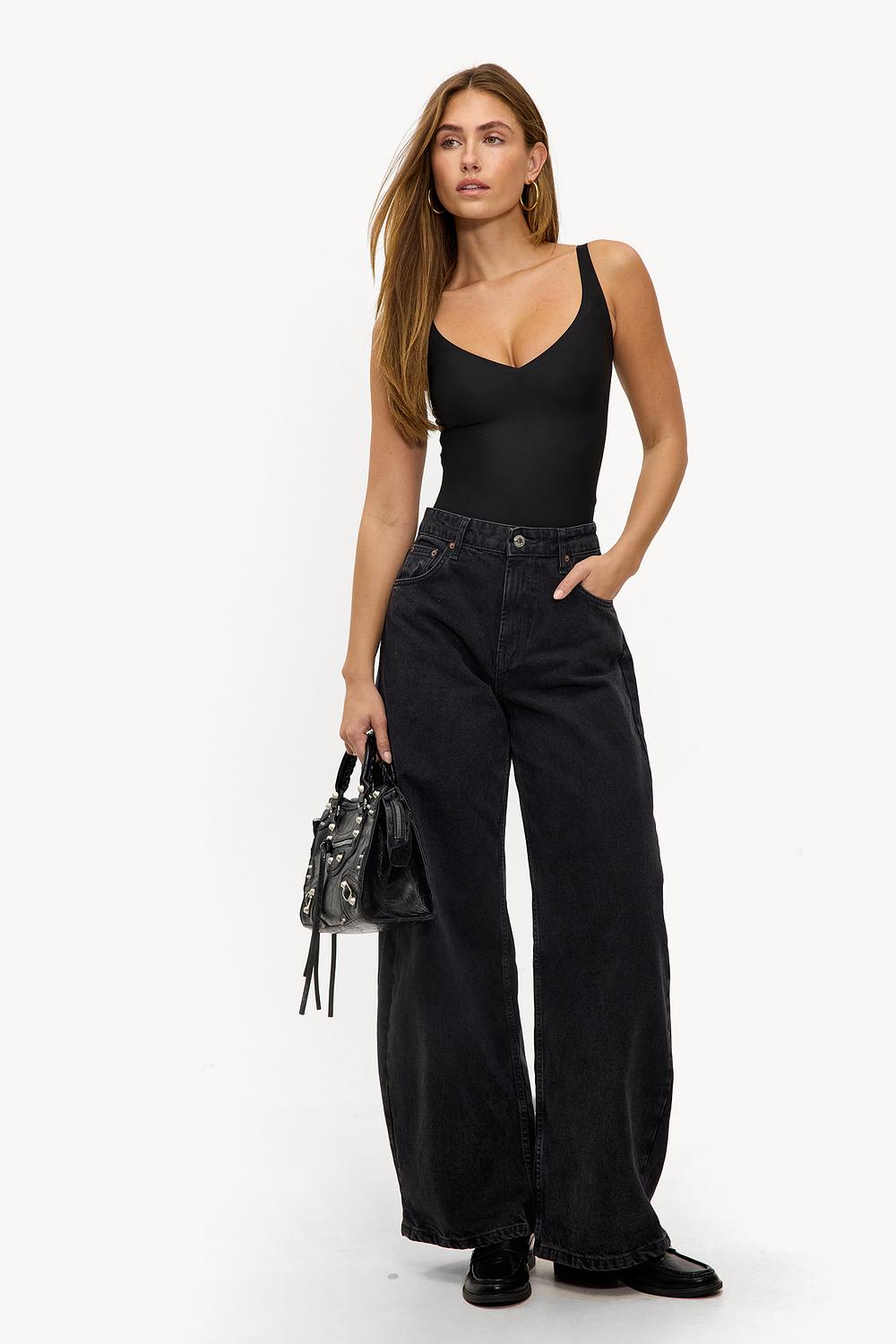 Black fitted bodysuit EUR 29.99This black bodysuit features a deep V-neck and subtle straps for a chic look. The tight fit accentuates the shape and provides a comfortable fit that falls perfectly under any outfit. The minimal details and classic black color make this bodysuit a versatile staple for your wardrobe. Style this bodysuit with wide-leg jeans for a casual chic look.