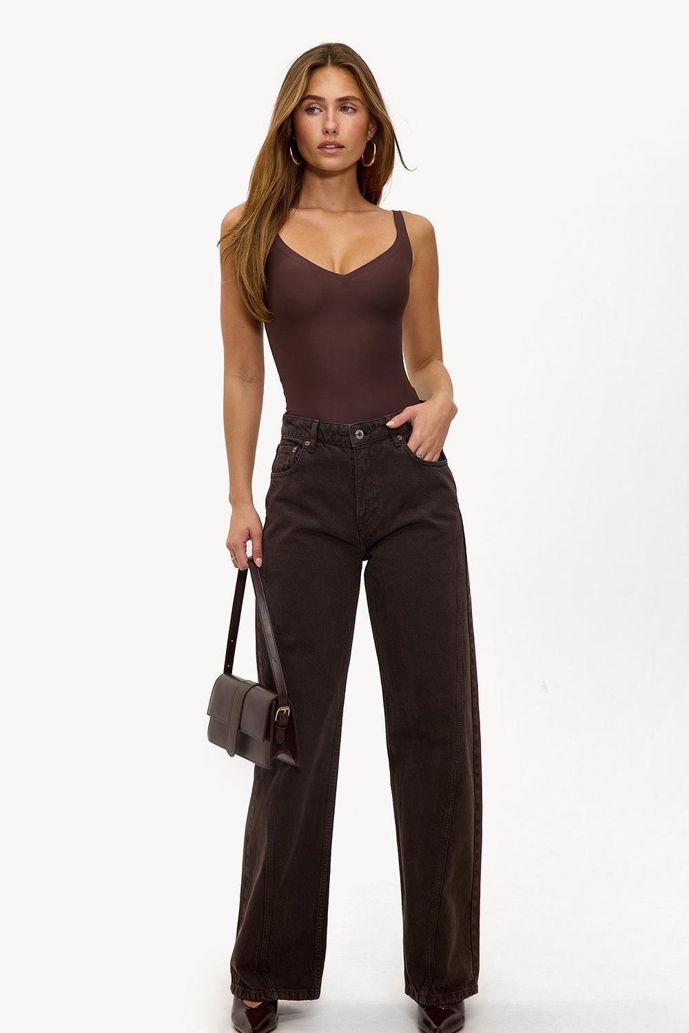 This dark brown bodysuit features a deep V-neck and a tight fit for a bodycon look. The stretch quality with elastane ensures comfort and a perfect shape. The basic design makes this bodysuit a versatile base for any outfit. Style this bodysuit with wide-leg jeans and statement accessories for a chic casual look.