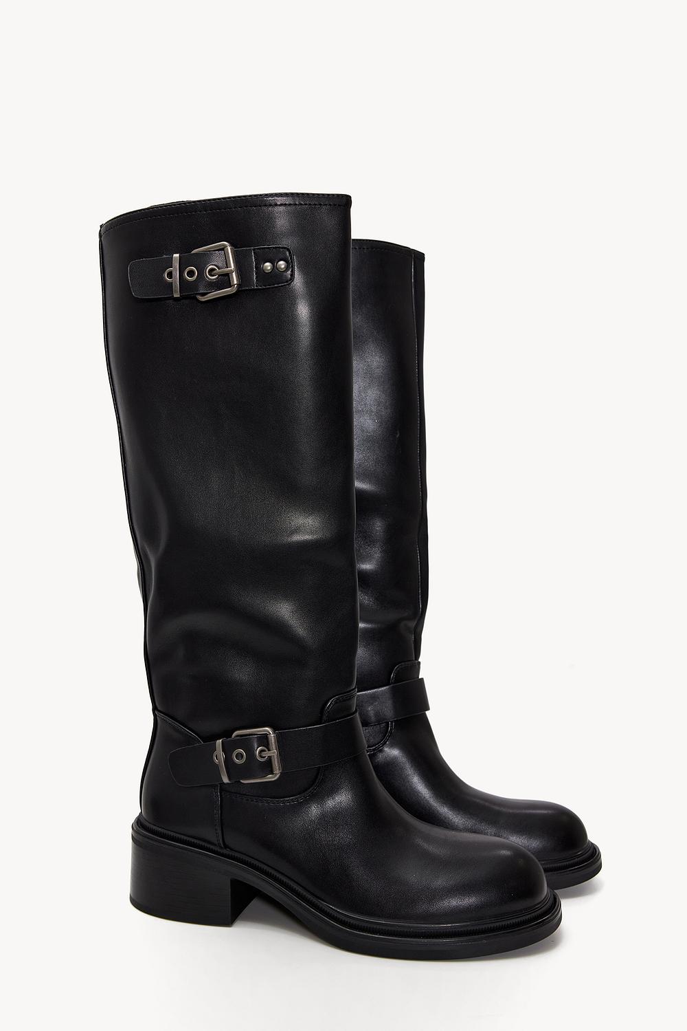These black high boots have a tough leather-look with statement buckle details. The high shaft with double buckles and sturdy block heel create an edgy look. The vegan leather finish gives these boots a luxurious appearance. Style these boots with a mini dress for a rock-chic look.