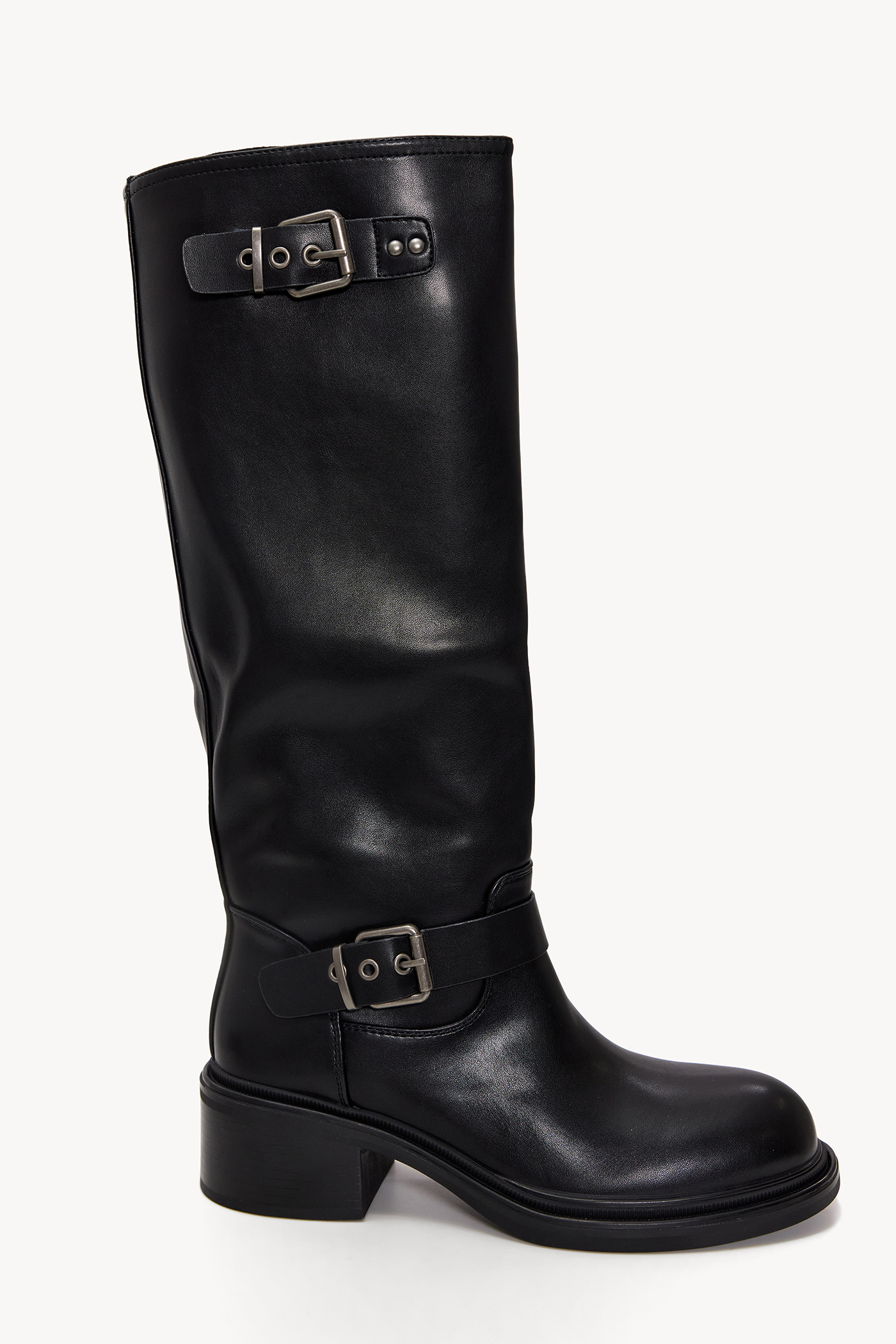 Black high boots EUR 69.99These black high boots have a tough leather-look with statement buckle details. The high shaft with double buckles and sturdy block heel create an edgy look. The vegan leather finish gives these boots a luxurious appearance. Style these boots with a mini dress for a rock-chic look.