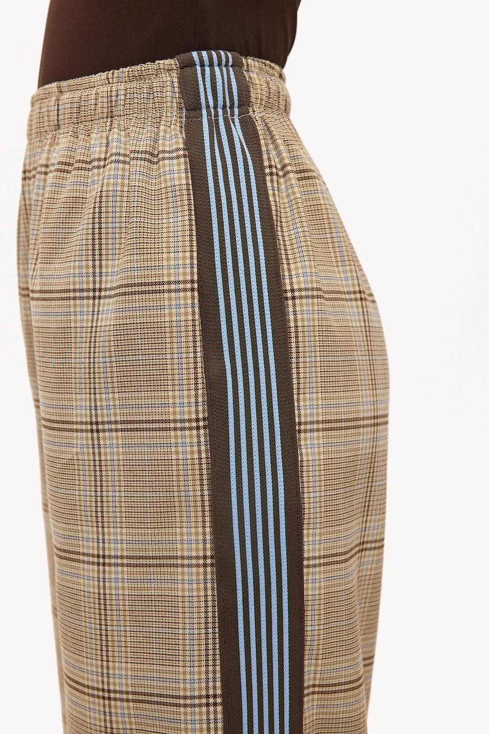 Beige checkered trousers with blue stripes EUR 49.99These wide-leg trousers feature a classic check pattern in warm brown tones with striking contrasting stripes on the side. The high-waisted fit with an elastic waistband ensures comfort and a flattering shape. The wide legs give a sophisticated twist to the timeless check motif. Style these statement trousers with a tailored blazer for a chic office look.