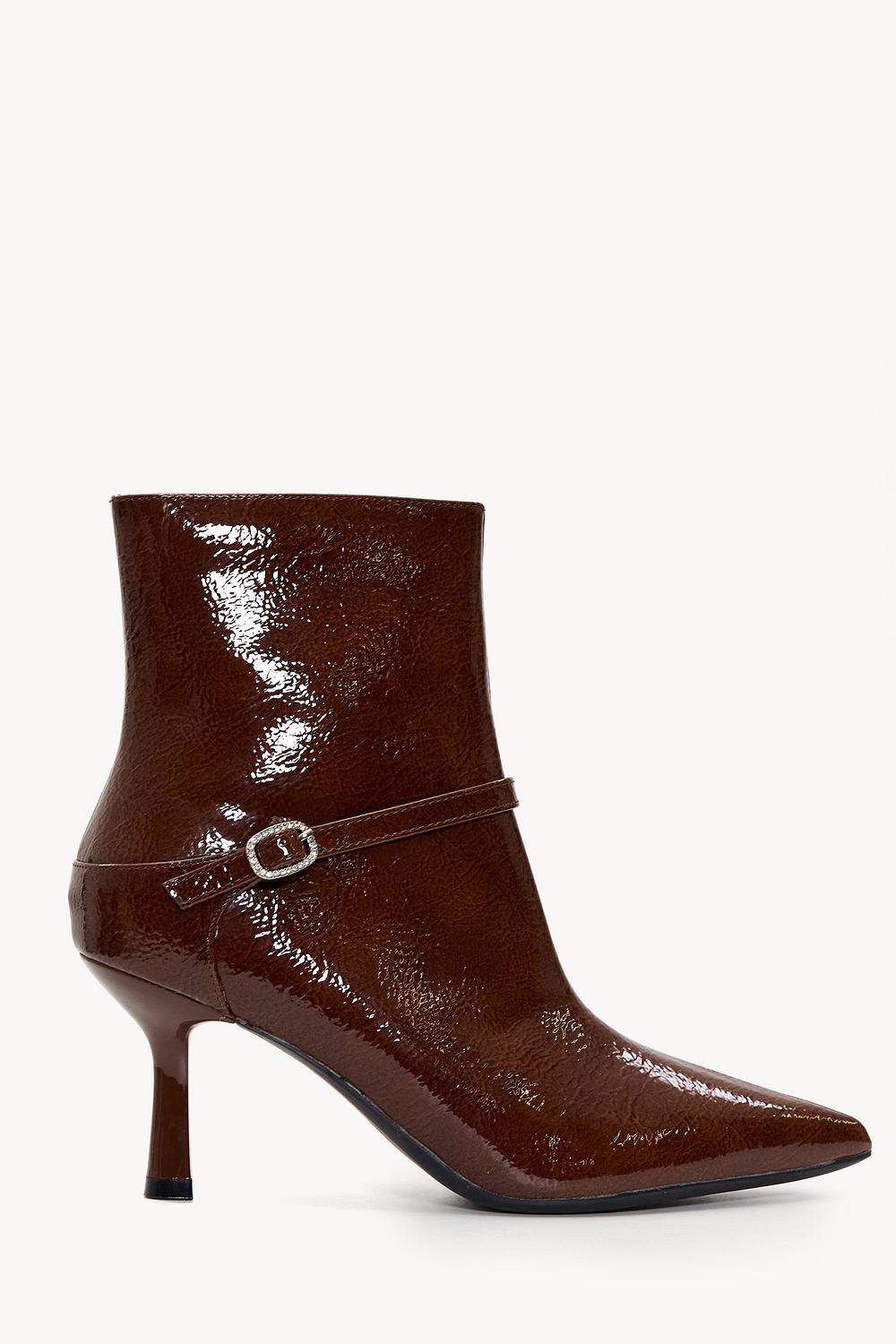 These dark brown heeled ankle boots have a glossy leather-look finish for a luxurious appearance. The pointed toe and mid-heel give these boots a chic twist. The ankle-height with subtle buckle details creates a modern look. Style these boots with leather-look trousers for a statement autumn outfit.