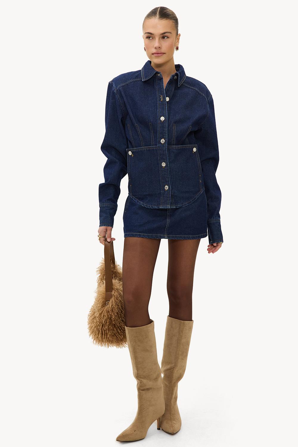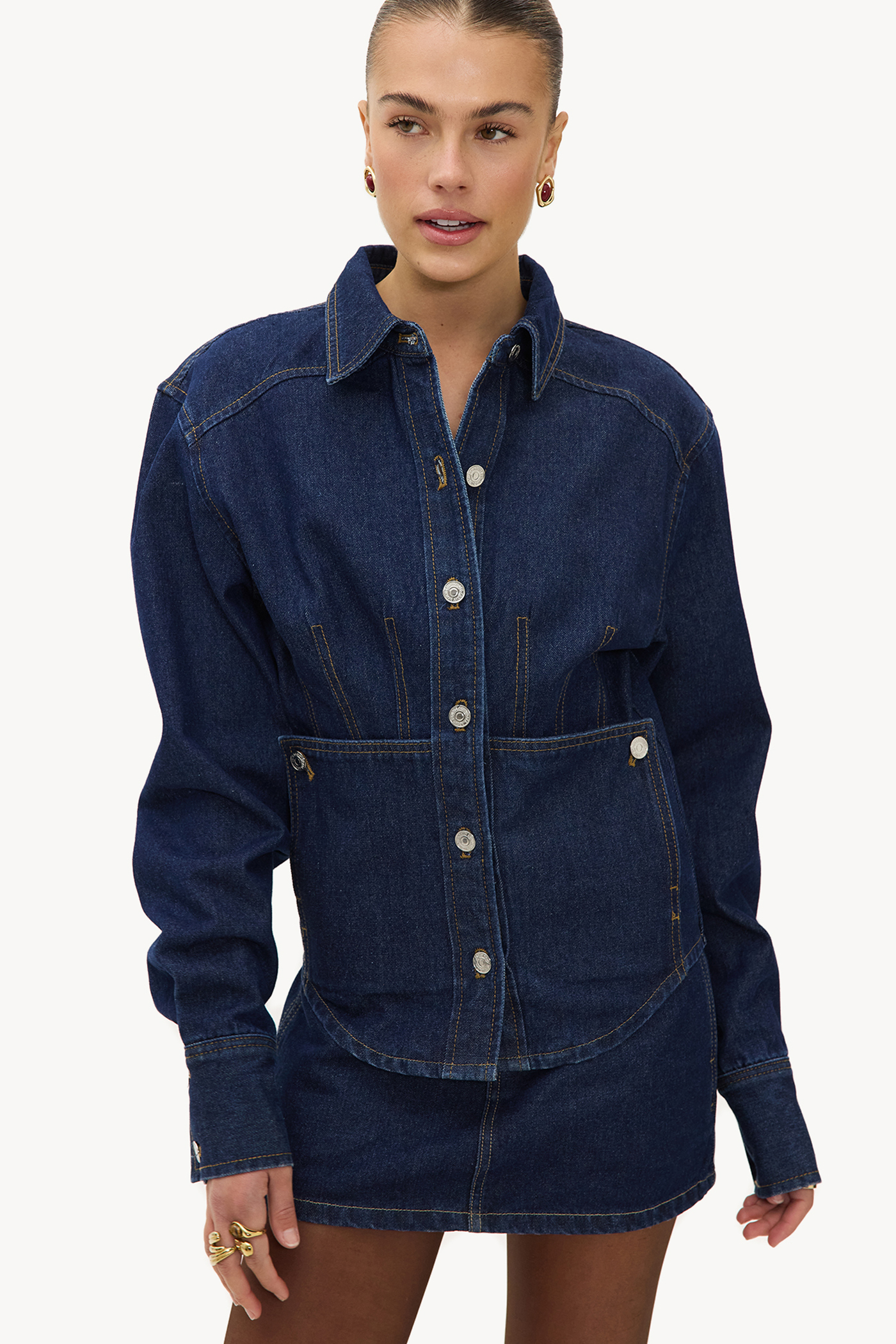 This dark blue denim blouse has an oversized fit with statement contrasting stitches. The classic collar and silver snap buttons give this item a modern twist. The waistband accentuates the shape for a tailored look. Style this blouse with a denim mini skirt for a chic denim-on-denim look.