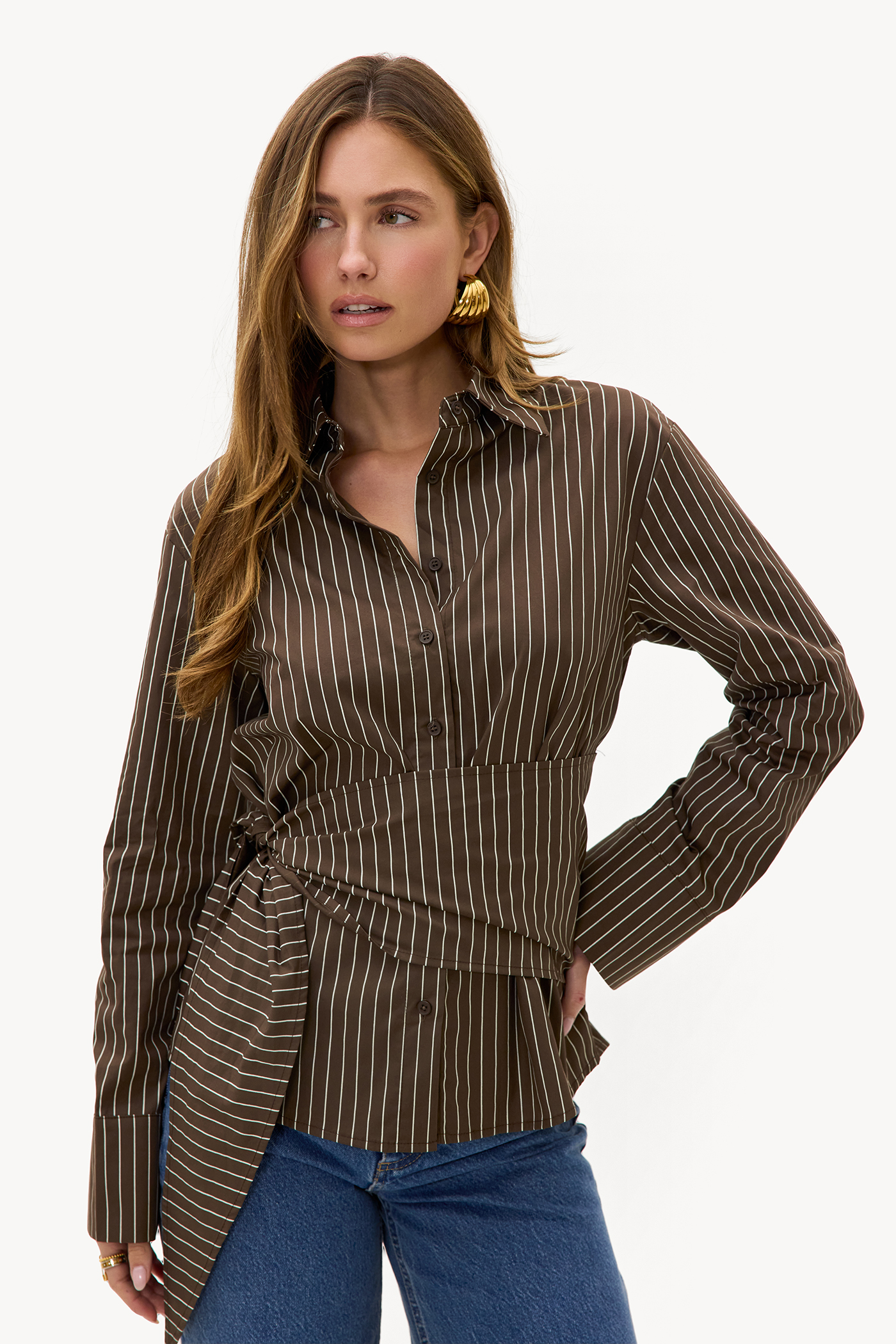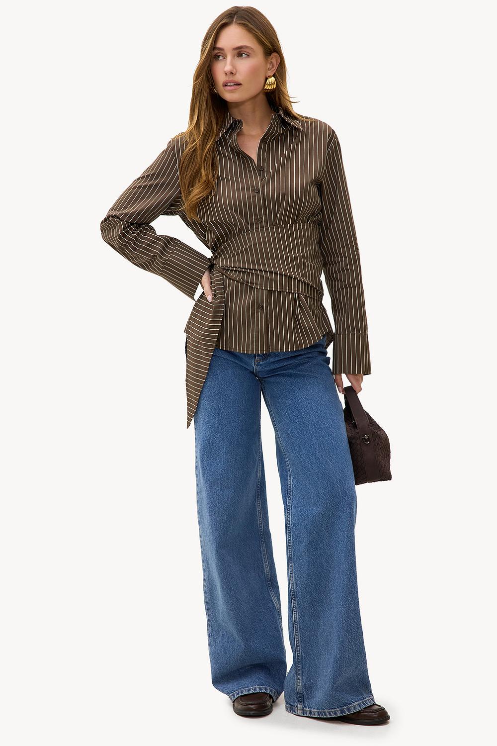 Dark brown striped blouse EUR 49.99This dark brown blouse features a classic pinstripe print and a statement tie belt that accentuates the waist. The tailored fit with button closure and long sleeves creates a sophisticated look. The 100% cotton quality ensures comfort and a luxurious appearance. Style this blouse with wide leg jeans for a chic office look.