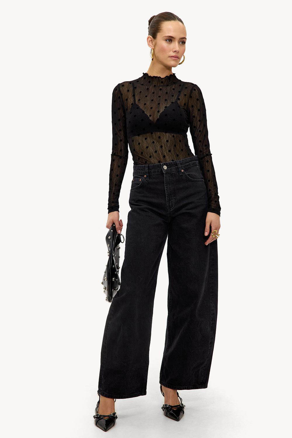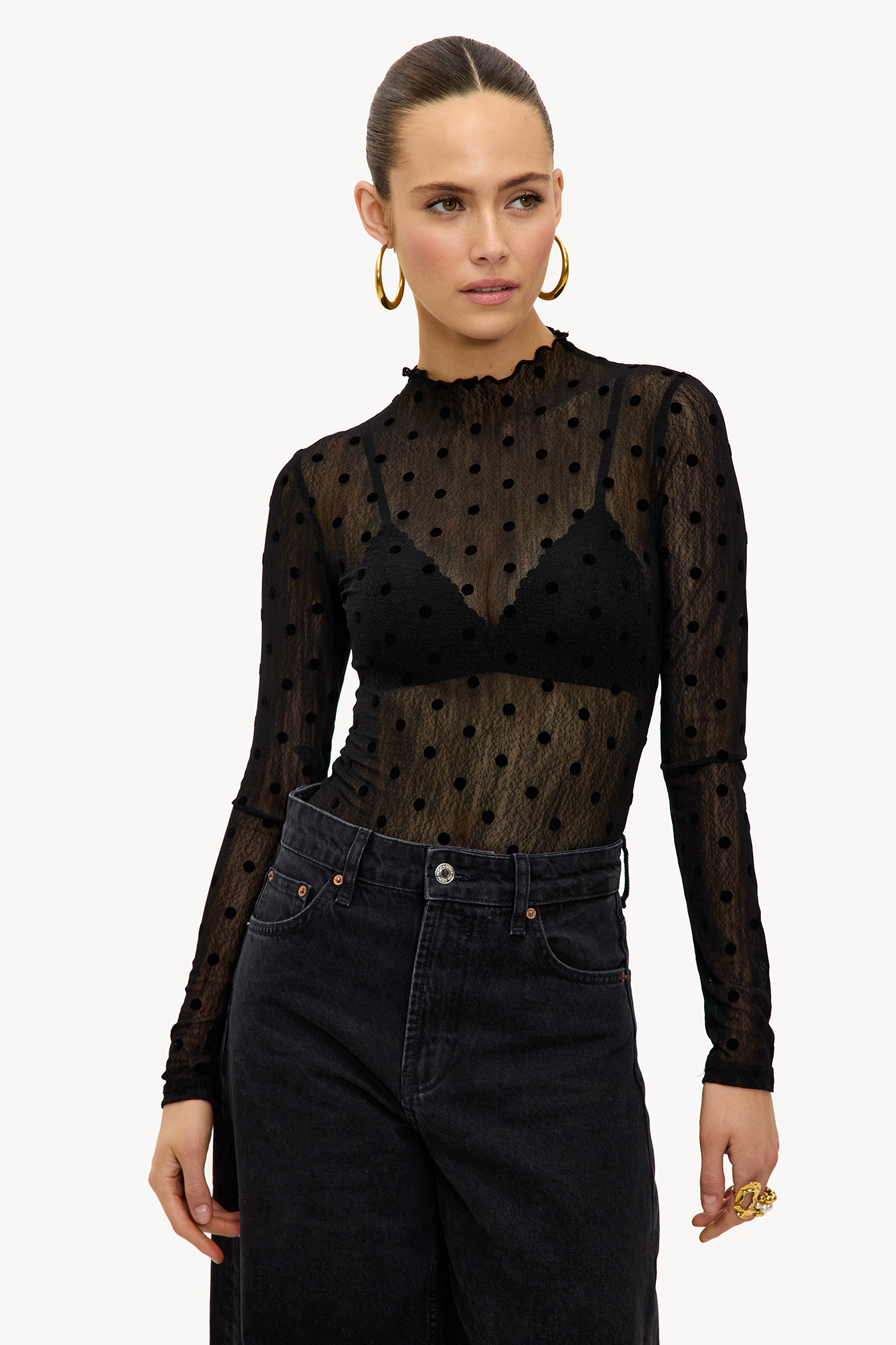 This black bodysuit features a sheer polka dot mesh with subtle ruffle details at the neckline. The long sleeve fit creates a statement look. The stretch quality ensures a comfortable fit that perfectly contours to the shape. Style this bodysuit with high-waisted wide-leg jeans for a chic evening look.