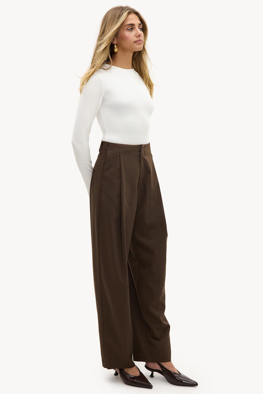 Brown pants EUR 49.99This brown straight pants have a high-waisted fit with statement pleats for a tailored look. The straight legs ensure comfort and freedom of movement. The warm chocolate brown color gives these pants a luxurious appearance. Style these pants with a fitted top and pointed heels for a chic office look.