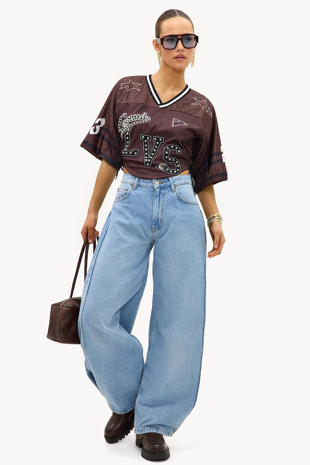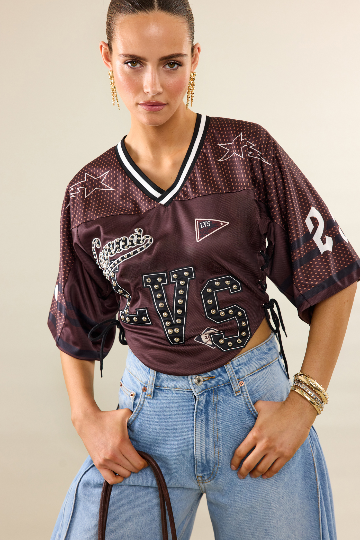 This dark brown top features a sporty baseball-inspired design with statement prints and stud details. The oversized fit with V-neck and contrasting trims creates a cool streetwear look. The side has adjustable laces for a custom fit and extra edge.