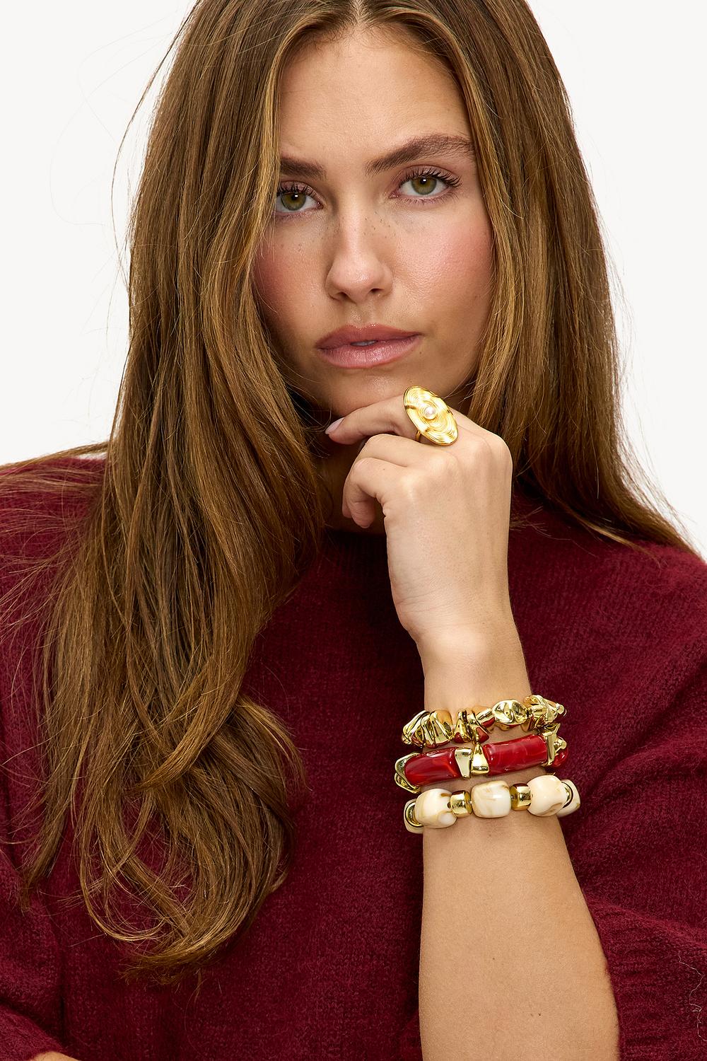 Gold 3-pack bracelets EUR 17.99This gold bracelet set consists of three different designs with statement details. The bracelets each have their own texture and color accents, including burgundy and cream elements. The chunky design with a gold finish creates a luxurious look. Style this set together for a bold accessory statement or wear them separately for a more subtle touch.
