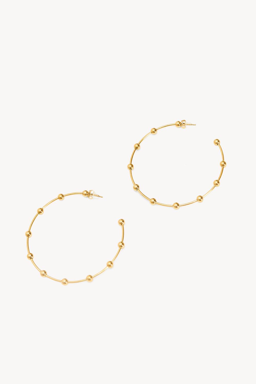 These gold hoop earrings feature a striking textured design with subtle bead details all over. The medium-sized hoops made of 100% stainless steel gold-plated provide a luxurious look. Perfect to give your everyday look a chic upgrade.