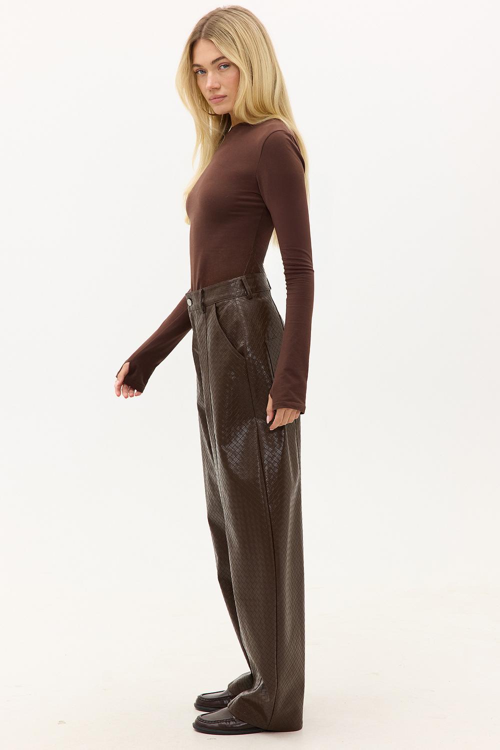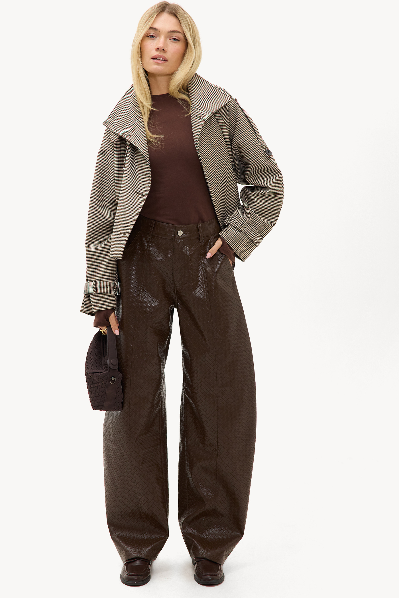 Dark brown PU balloon trousers EUR 59.99This dark brown wide leg pants feature a luxurious textured design all over. The high-waisted fit with wide legs creates a statement look that is perfect for office days or a chic evening out. The cotton blend ensures comfort and a premium appearance. Style these pants with a fitted top and statement accessories for a complete look.