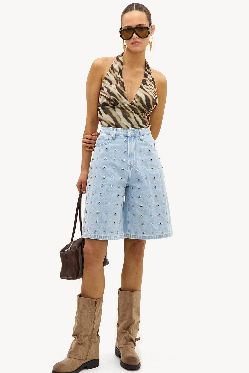 Brown printed halter top EUR 25.99This mesh halter top features a striking zebra print in warm brown tones for a statement look. The wrap design with a deep V-neck and halter closure creates a flattering shape. The stretchy polyester blend ensures comfort and a perfect fit. Style this top with high-waisted denim shorts for a casual city trip look.