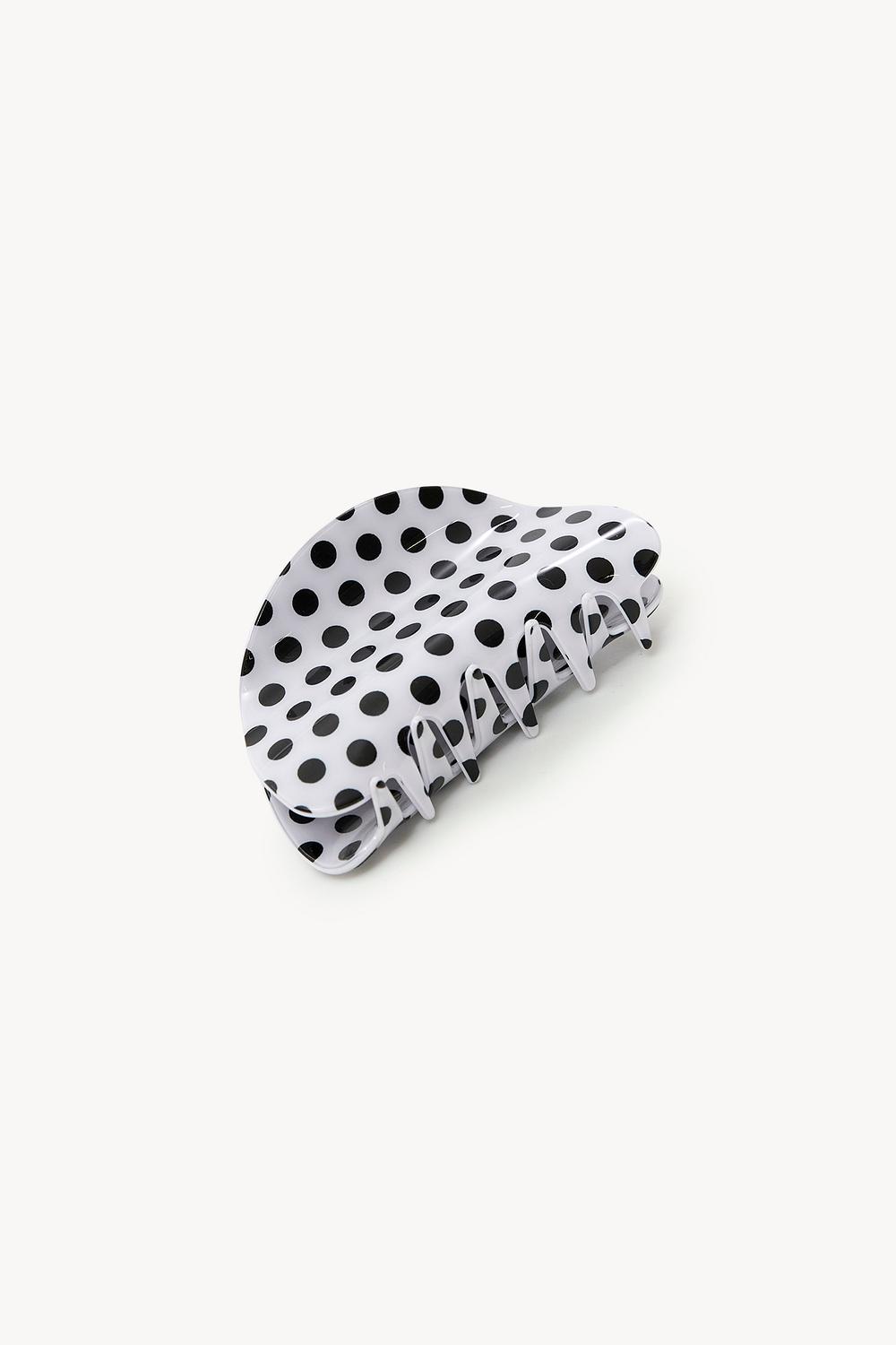 White hair clip with dots EUR 9.99This white hair clip features a striking polka dot print with black dots for a retro touch. The scalloped design with subtle ruffles creates a statement look. The clip is perfect for securing your hair in a chic updo or half-up style.
