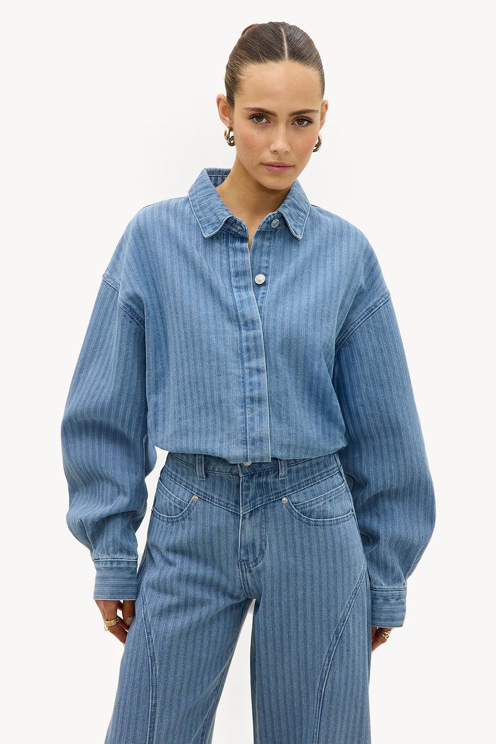 Blue striped denim blouse EUR 59.99This stonewashed denim blouse features a striking pinstripe pattern for a statement look. The oversized fit with a classic collar and button closure creates a relaxed yet chic appearance. The soft cotton blend ensures comfort and a luxurious feel. Style this blouse with the matching wide leg jeans for a stunning co-ord look.