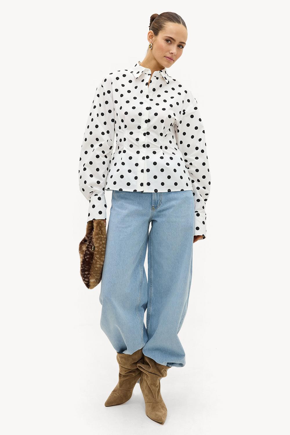 White blouse with polka dots EUR 49.99This white blouse features a striking polkadot print all over for a timeless statement look. The balloon sleeves and button closure add a classic twist to the design. The 100% cotton quality ensures comfort and a luxurious appearance. Style this blouse with wide-leg jeans for a chic casual look.