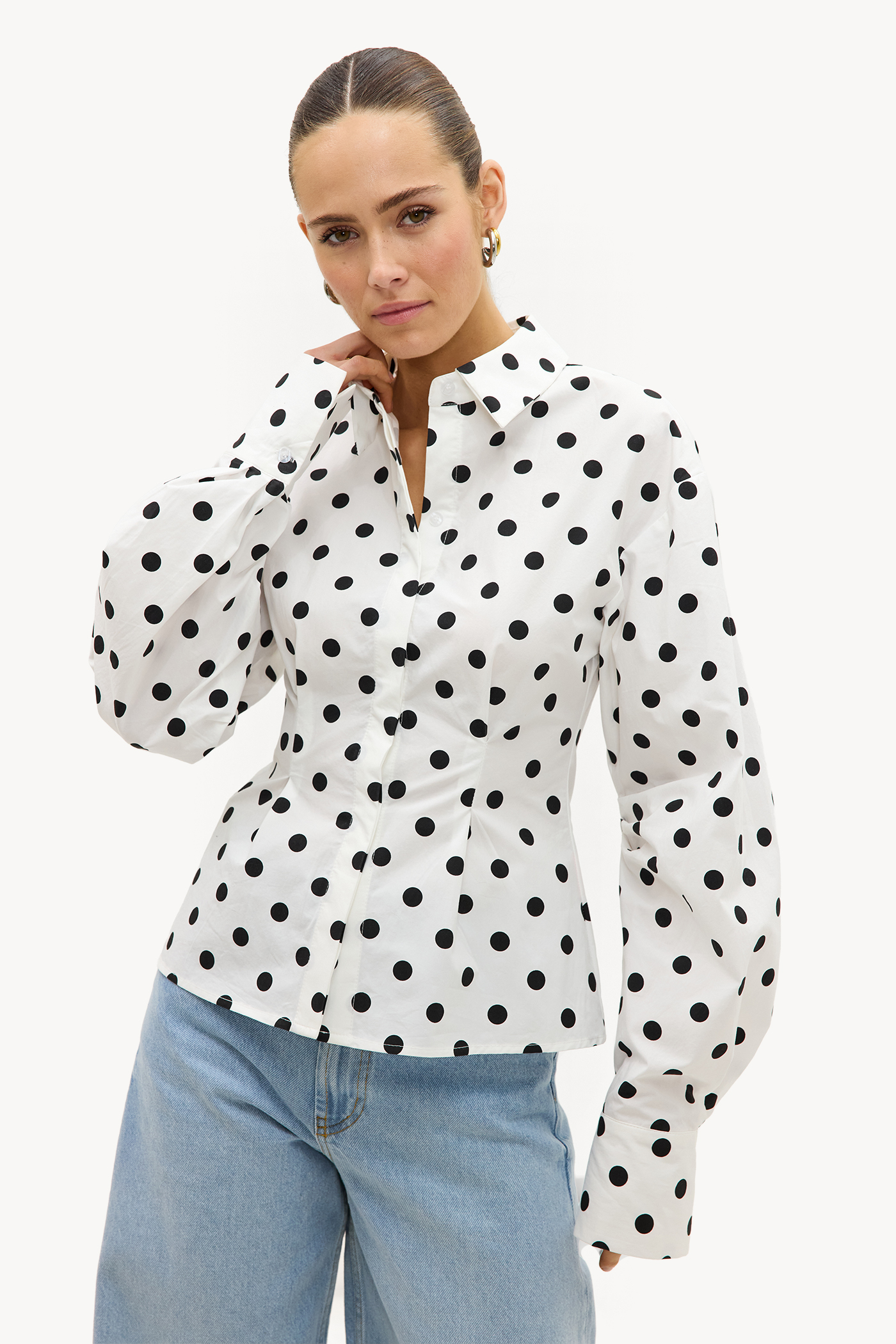 White blouse with polka dots EUR 49.99This white blouse features a striking polkadot print all over for a timeless statement look. The balloon sleeves and button closure add a classic twist to the design. The 100% cotton quality ensures comfort and a luxurious appearance. Style this blouse with wide-leg jeans for a chic casual look.