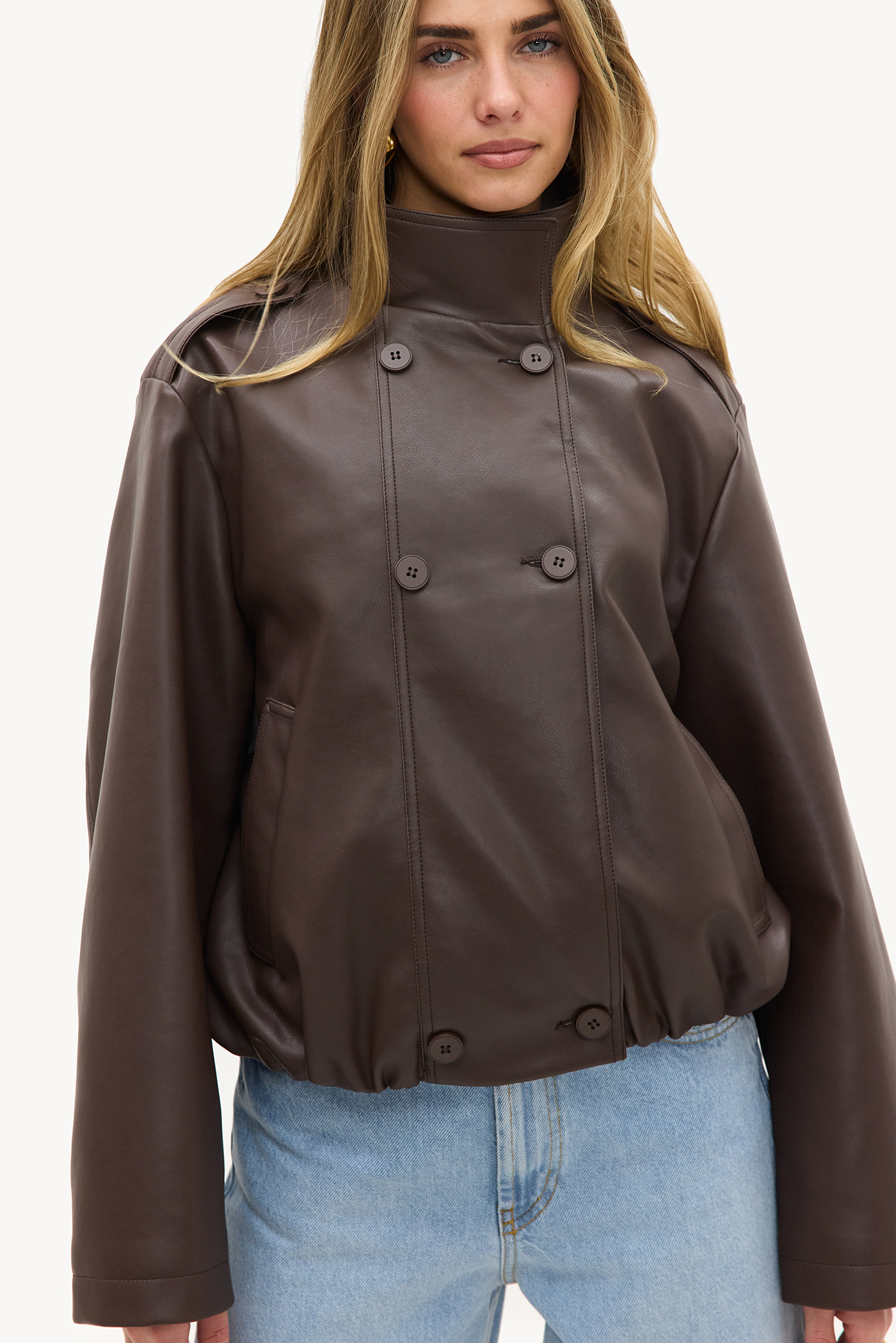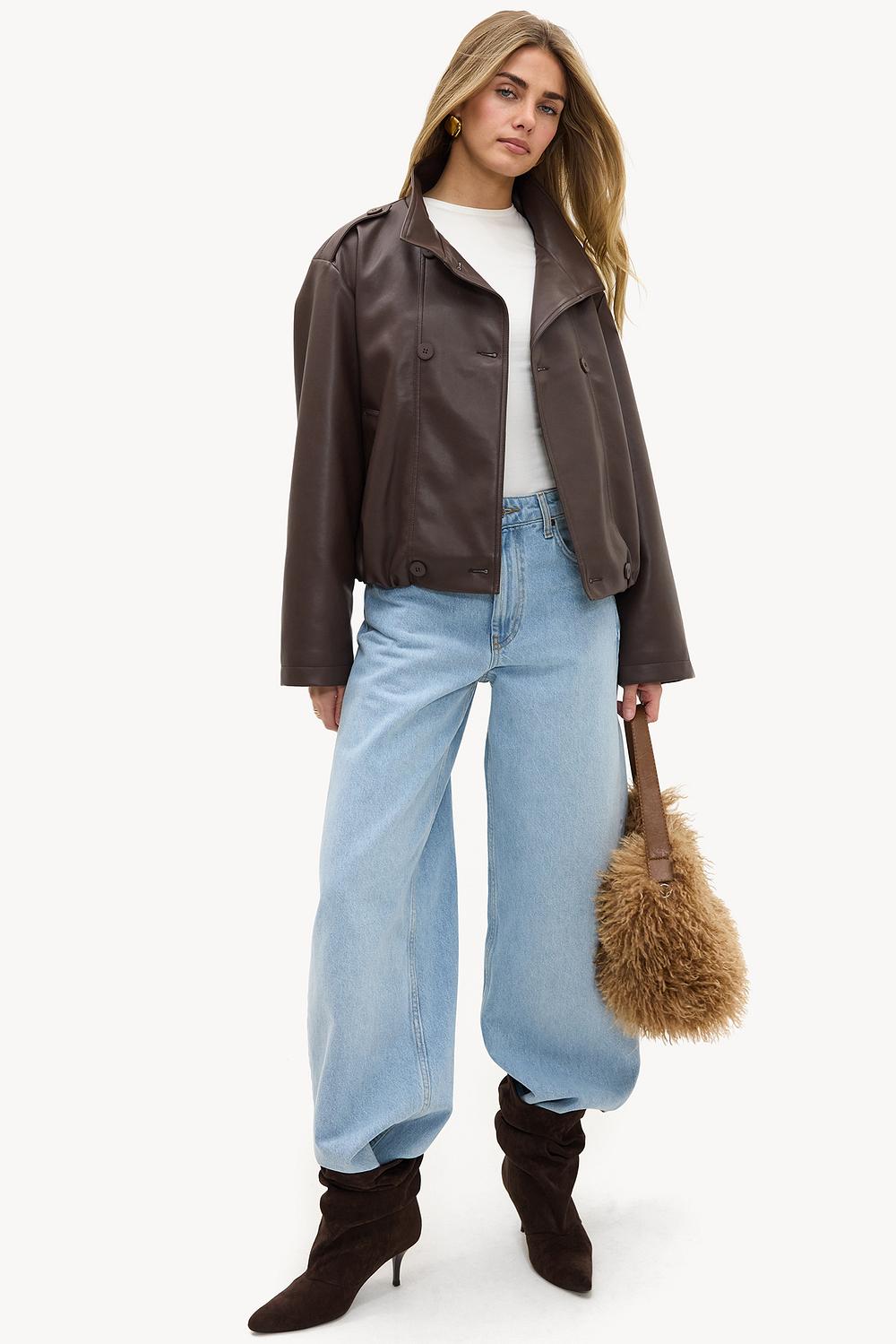 Brown PU jacket EUR 59.99This brown faux leather jacket features a statement high neck and oversized fit for a cool twist. The double-breasted buttons and epaulettes give this vegan leather design a military-inspired look. The cropped fit creates a modern shape. Style this jacket with wide-leg jeans and boots for an edgy casual look.