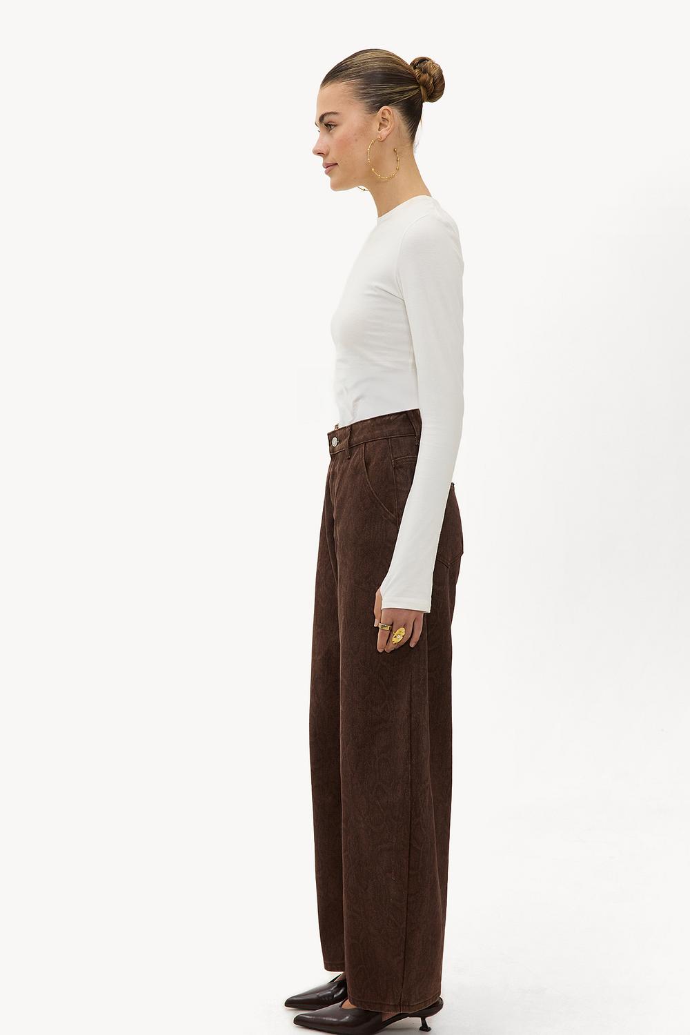 Brown balloon jeans with snake print EUR 59.99This brown balloon fit trousers feature a snake print for a statement look. The high-waisted fit with wide legs creates a chic vintage appearance. The cotton blend ensures comfort and a premium feel. Style these trousers with a fitted top and pointed toe boots for a sophisticated look.