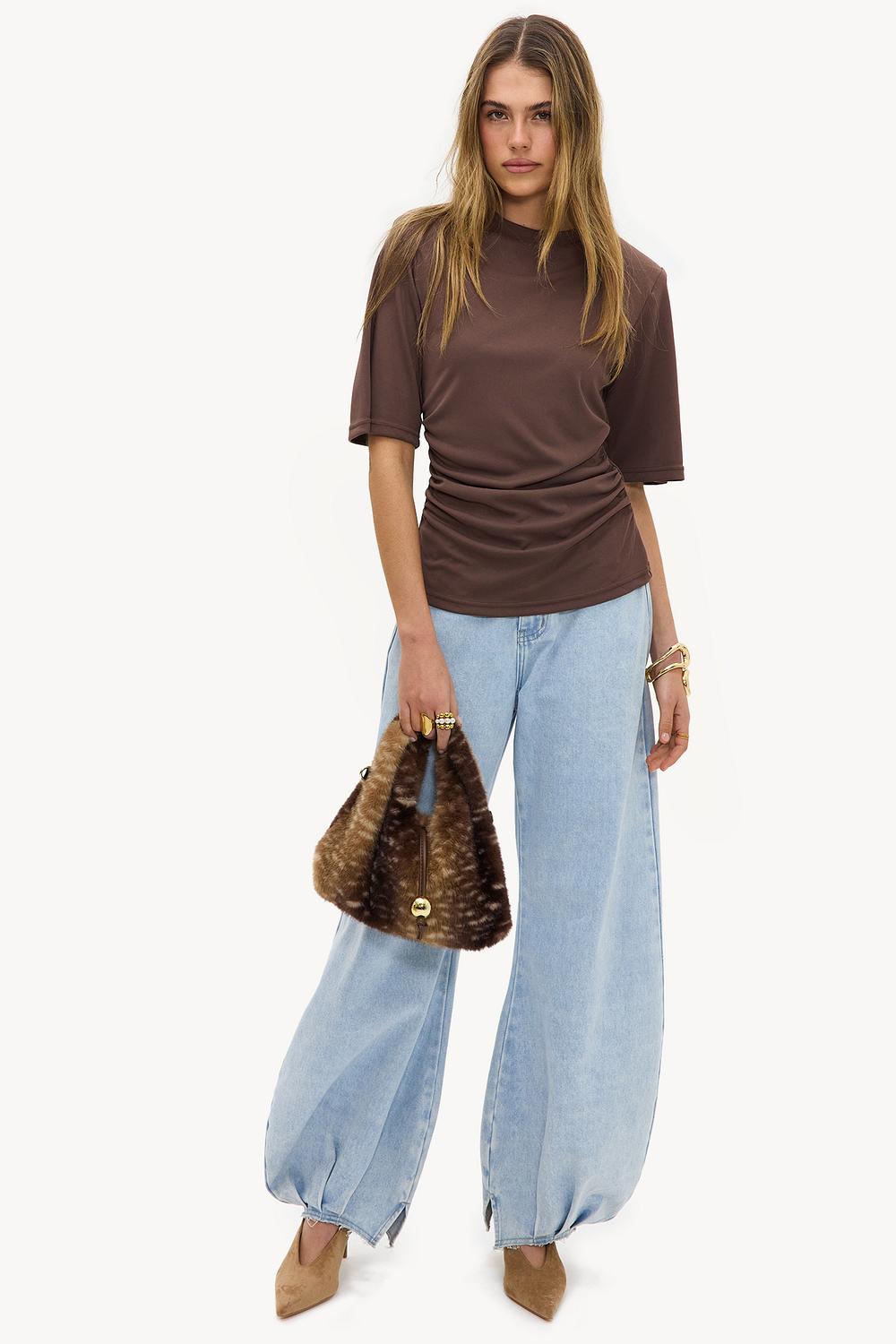 Brown top EUR 29.99This brown T-shirt has an oversized fit with short sleeves and subtle ruching on the sides. The relaxed fit with a crew neck creates a casual yet chic look. The soft polyester blend ensures comfort and a nice drape. Style this top with wide-leg jeans for an effortless casual look.