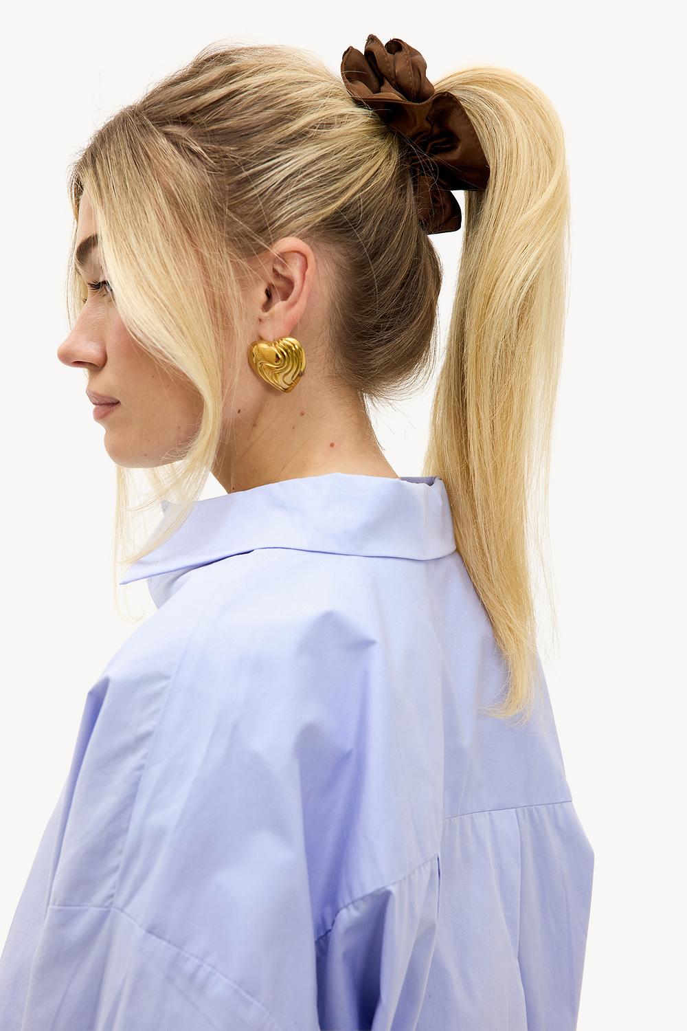Dark brown scrunchie EUR 7.99This dark brown scrunchie has a luxurious satin-like finish for a chic touch. The soft polyester material ensures comfort and a strong grip without damaging your hair. The brown color makes this scrunchie perfect for both casual and elegant looks. Style this scrunchie with a sleek ponytail or messy bun for an effortless chic appearance.