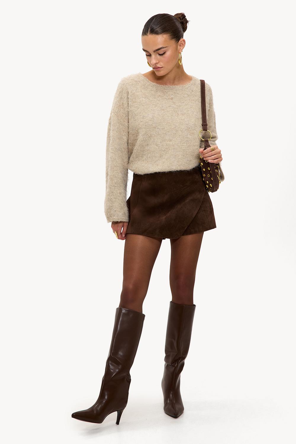 This dark brown suede-like skort features an asymmetrical wrap design for an edgy look. The luxurious texture and short fit with integrated shorts create a modern twist on the classic skirt. The asymmetrical detail at the front adds extra movement and a statement touch.