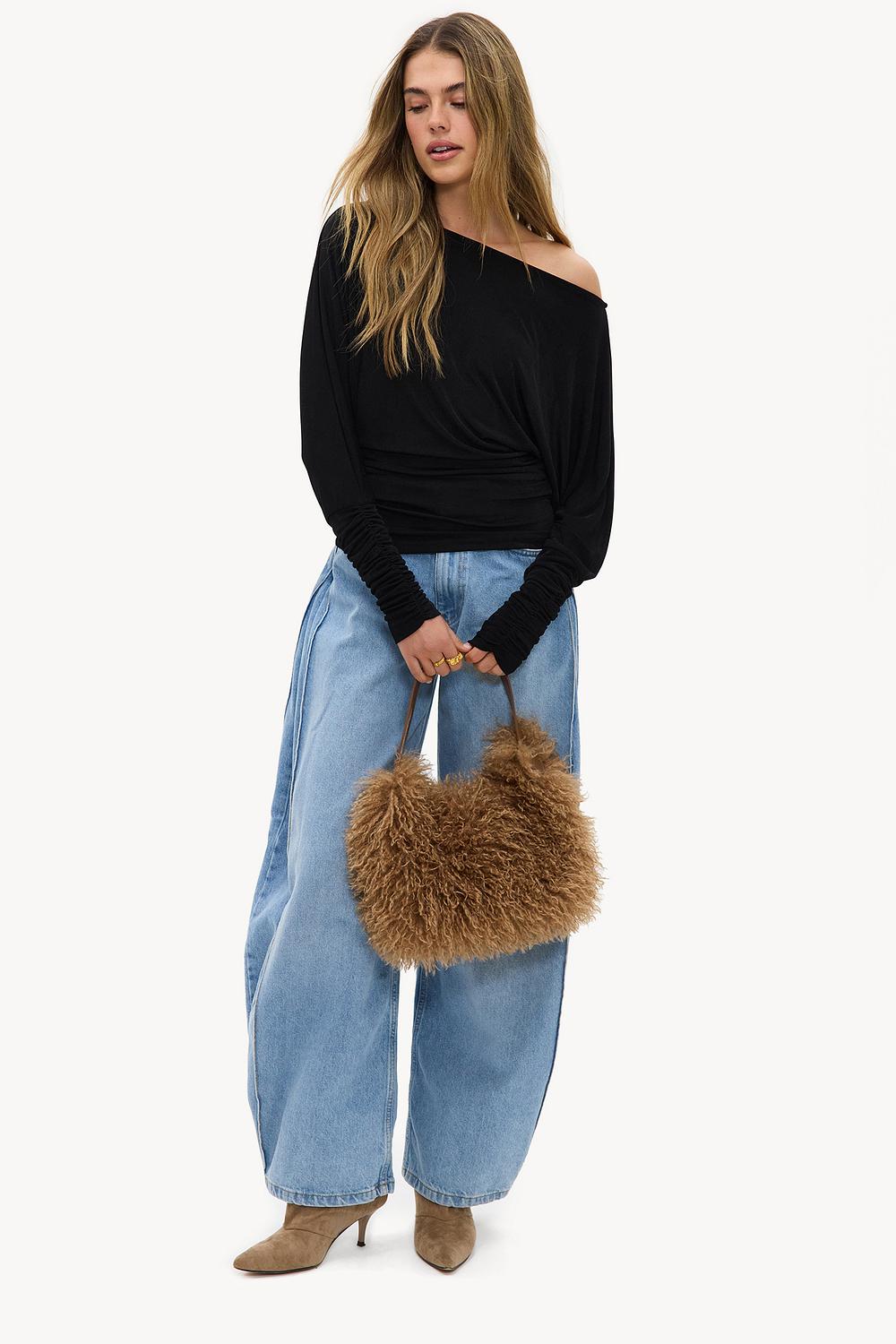 Black top EUR 35.99This black off-shoulder long sleeve has an oversized fit with draped details for a relaxed look. The asymmetrical neckline and elastic waist provide a modern twist on the classic design. The soft polyester blend offers comfort and freedom of movement. Style this top with wide leg jeans for a casual chic appearance.