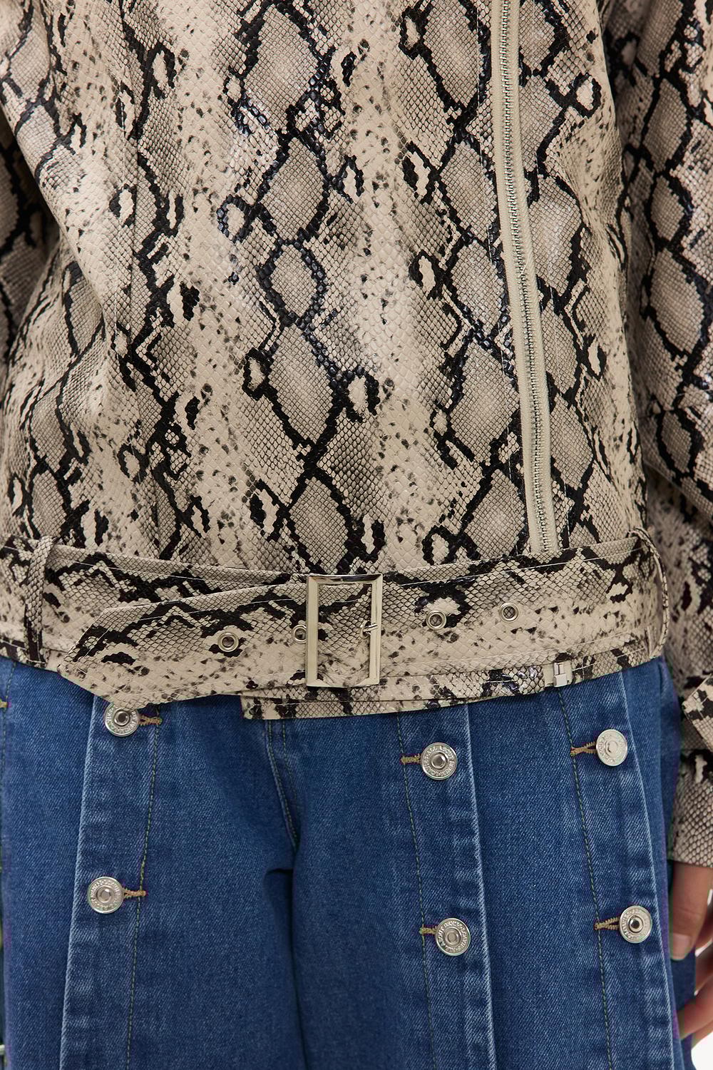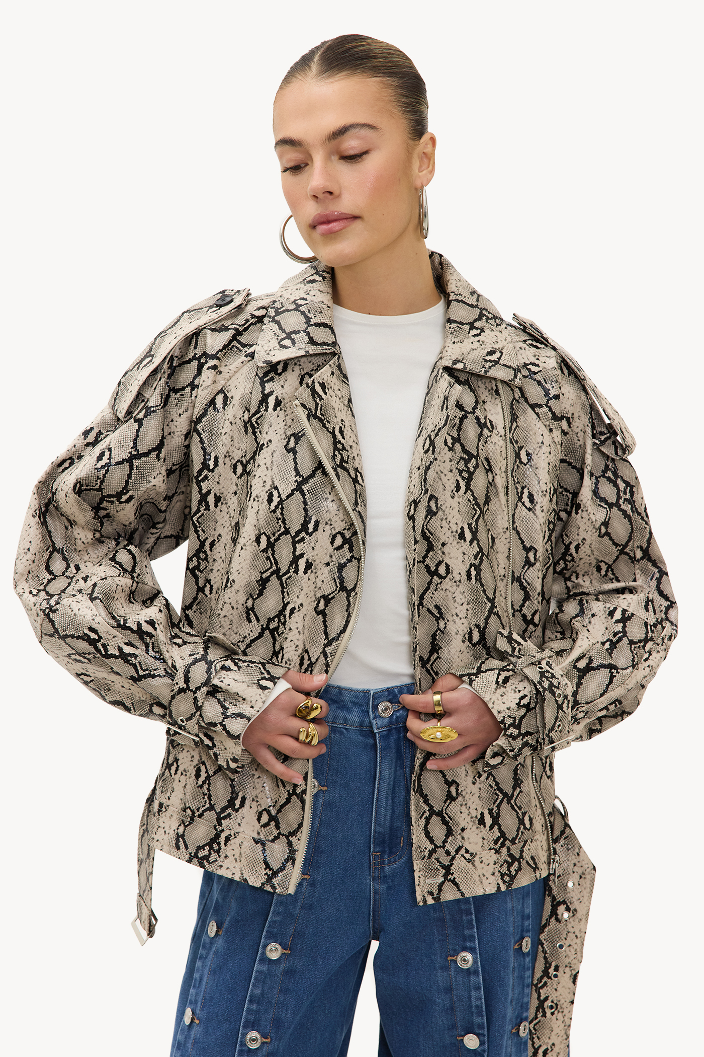 Off-white PU jacket with snake print EUR 79.99This vegan leather jacket features a striking snake print all over for a statement look. The oversized fit with zipper closure and tie detail at the bottom creates a cool twist on the classic biker jacket design. The soft PU leather quality ensures comfort and a luxurious appearance. Style this jacket with a basic tee and wide-leg jeans for an edgy casual look.
