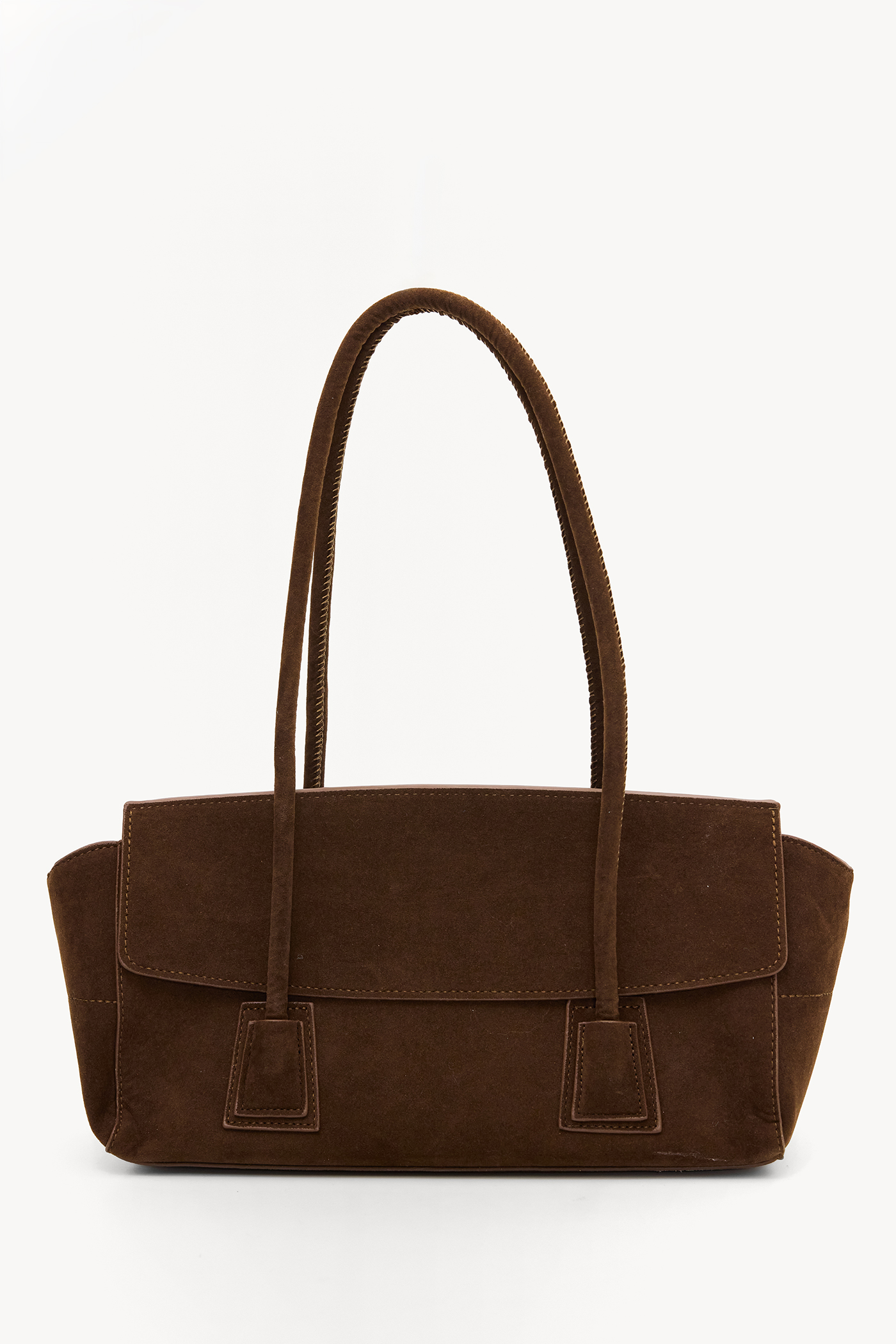 This brown suede-like handbag has a chic structured design with contrasting stitching. The spacious tote bag with double handles and flap closure offers plenty of room for your daily essentials. The warm chocolate brown color and luxurious texture make this bag perfect for office days or a shopping spree.